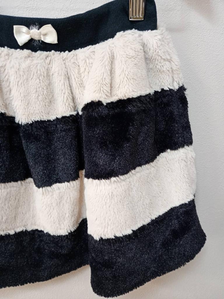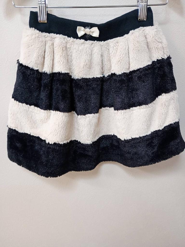 【メーカーサイズ】120 W49~54 【実寸(cm)】W47~ スカート丈32 【素材】表地(シャギー部分)ポリエステル 裏地:ポリエステル ポリウレタン スパンテレコ部分:綿 ポリウレタン 【デザイン・色】薄ベージュ 黒 ボーダー柄 ファー地 横ポケット ウエストゴム 前飾りリボン 裏地あり 【状態】少々毛羽立ち |