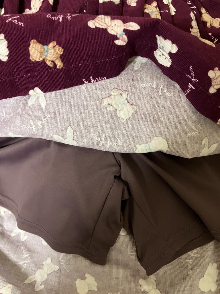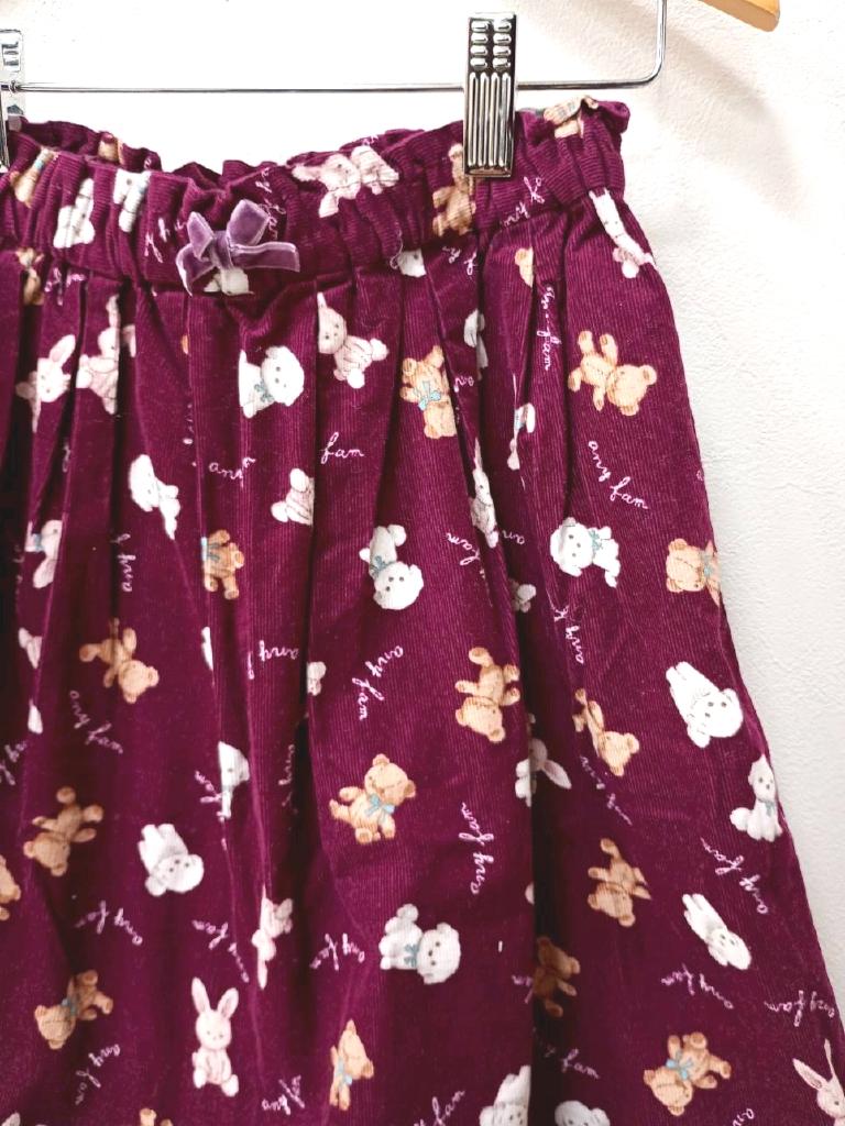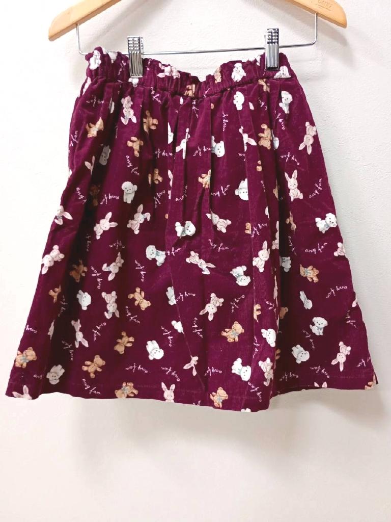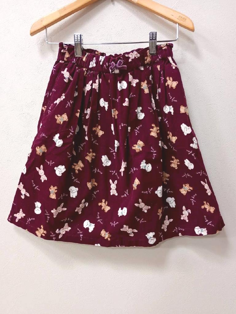 【メーカーサイズ】150 T140~150 W58~63 【実寸(cm)】W56~ スカート丈46 【素材】スカート:綿 インナーパンツ:ポリエステル 【デザイン・色】紫 白 薄ピンク等 コーディロイ 横ポケット ウエストゴム 前飾りリボン インナーパンツ付 アニマル 総柄 スカパン 【状態】少々毛羽立ち |