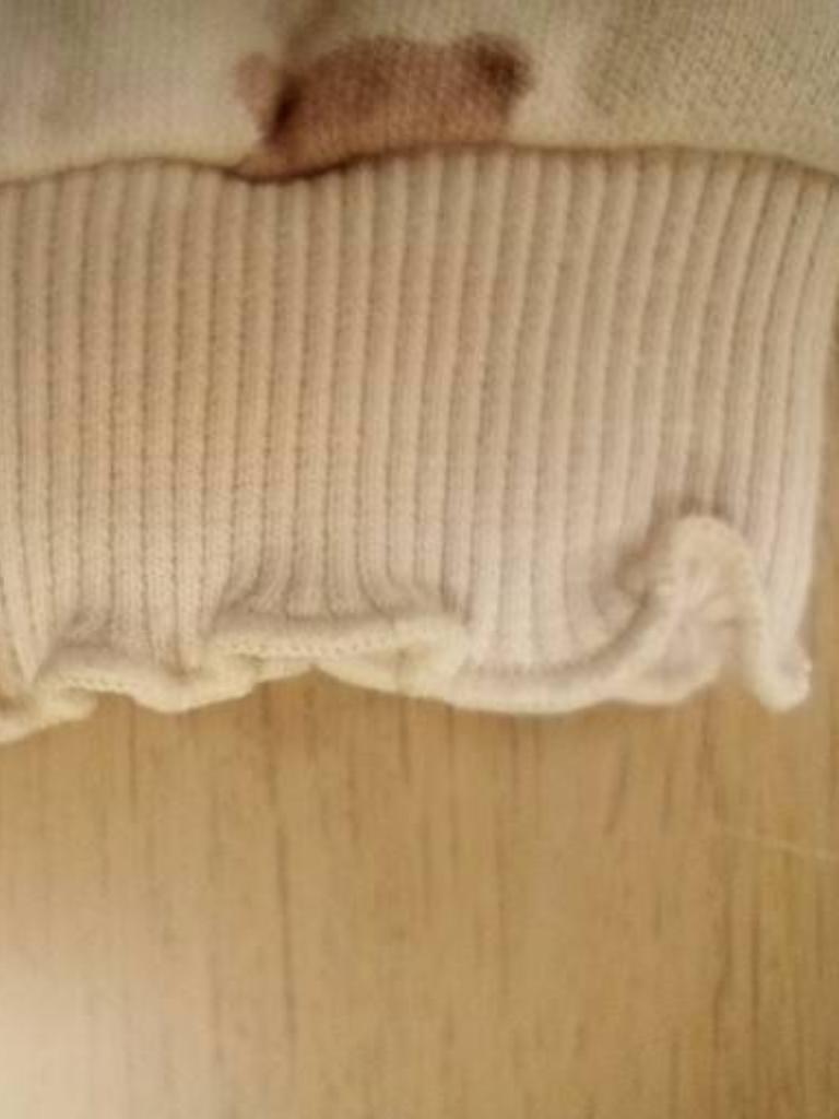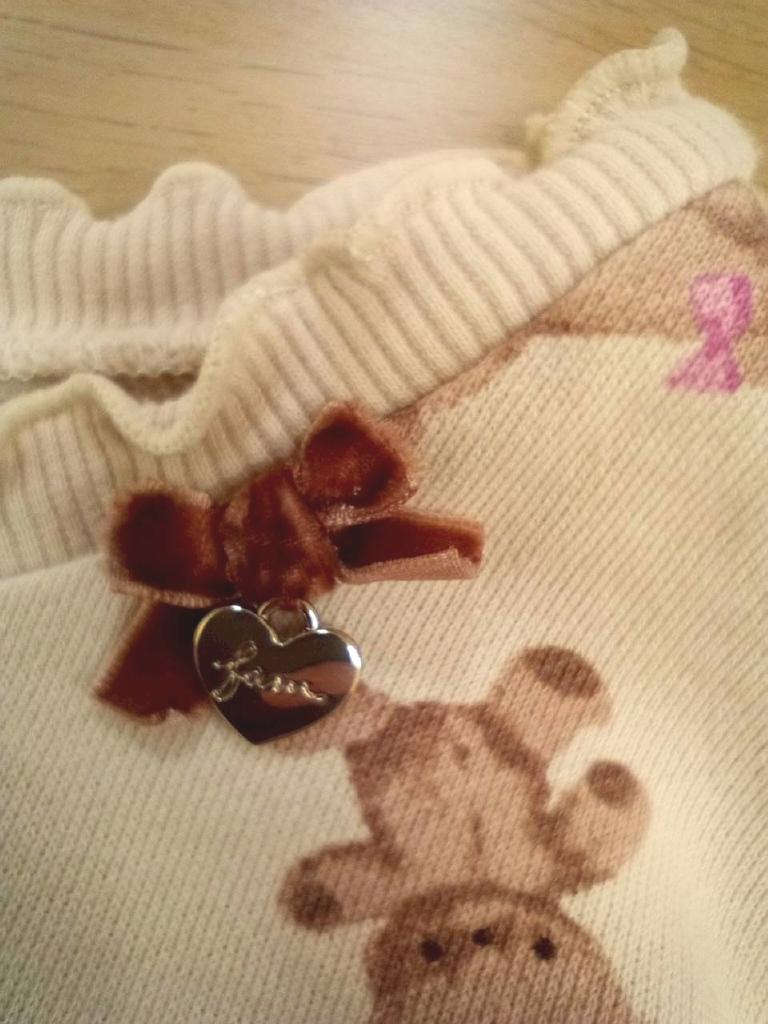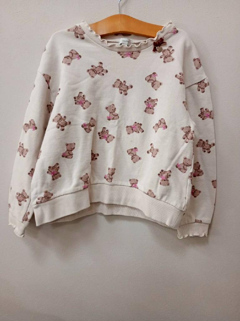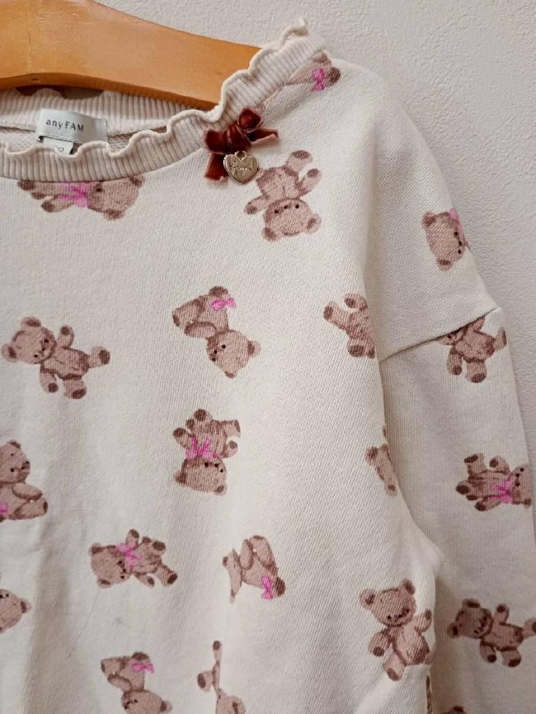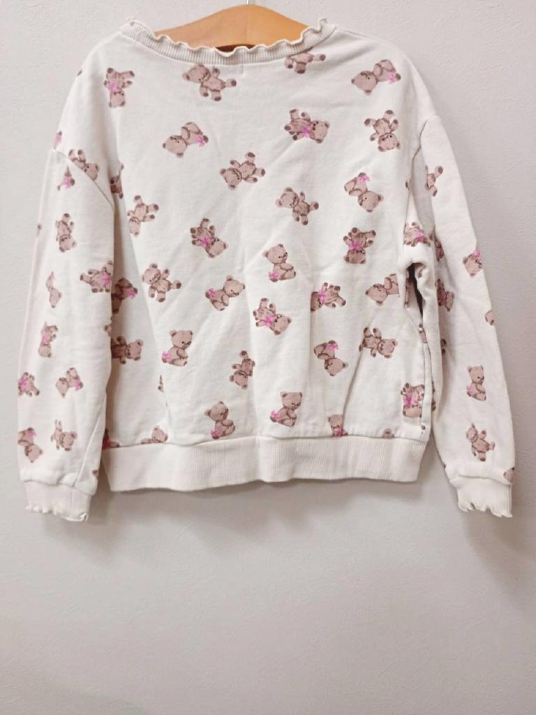 【メーカーサイズ】140 T130~140 W63~71 【実寸(cm)】身幅43.5 着丈42.5 袖丈38 【素材】本体:綿 リブ部分:綿 ポリウレタン 【デザイン・色】ベージュ クマ柄 トレーナー地 前衿元飾りリボン・チャーム付 袖口・衿元リブフリル 【状態】少々毛羽立ち |