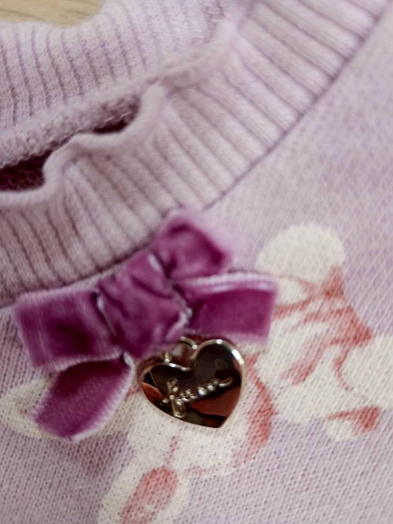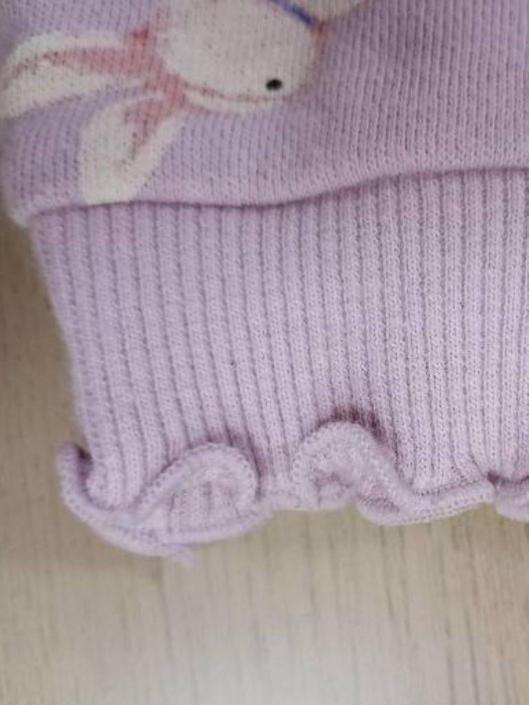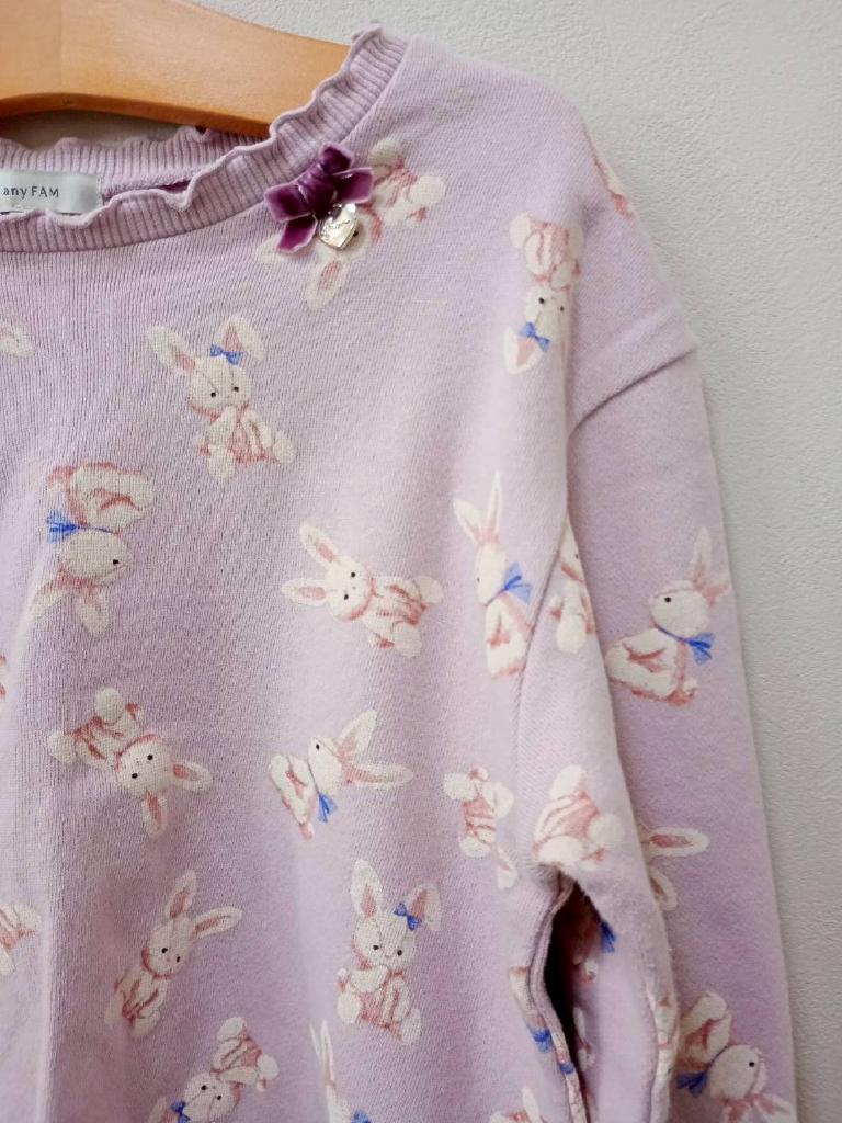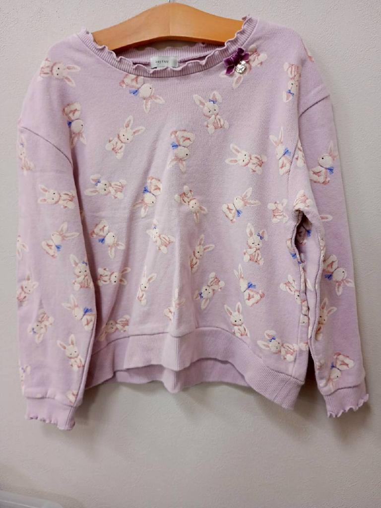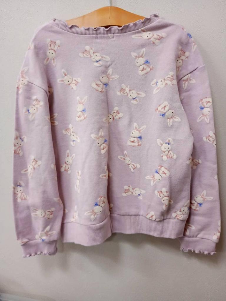 【メーカーサイズ】140 T130~140 W63~71 【実寸(cm)】身幅41.5 着丈42.5 袖丈39 【素材】本体:綿 リブ部分:綿 ポリウレタン 【デザイン・色】ラベンダー ウサギ柄 トレーナー地 前衿元リボン・チャーム付 袖口・衿元リブフリル 【状態】少々毛羽立ち |
