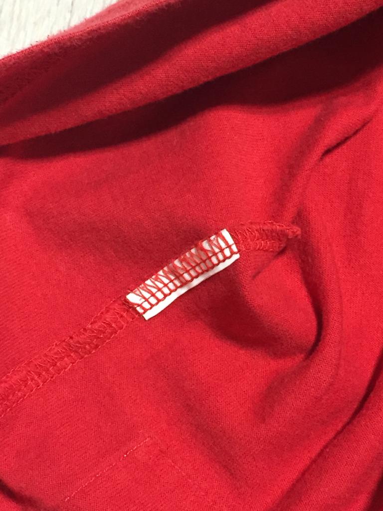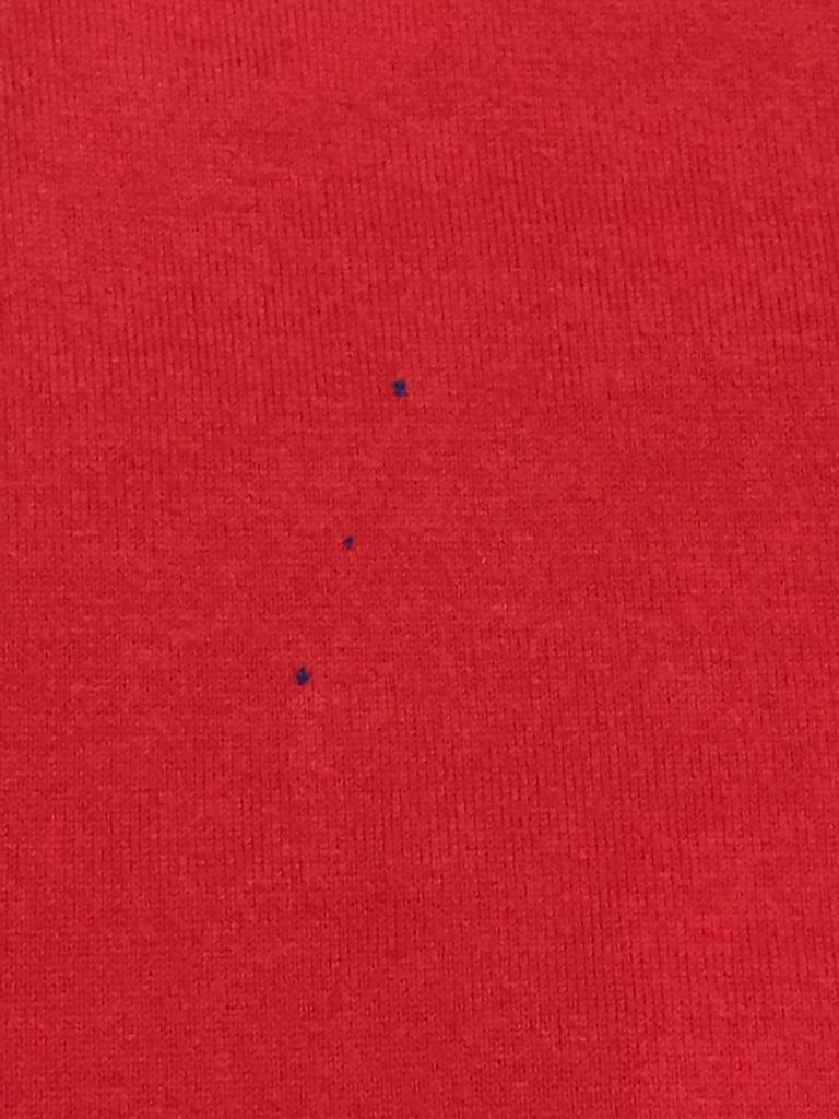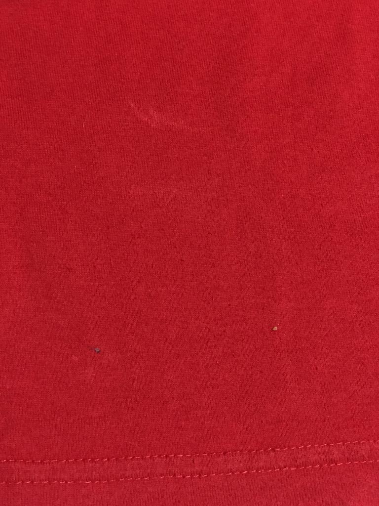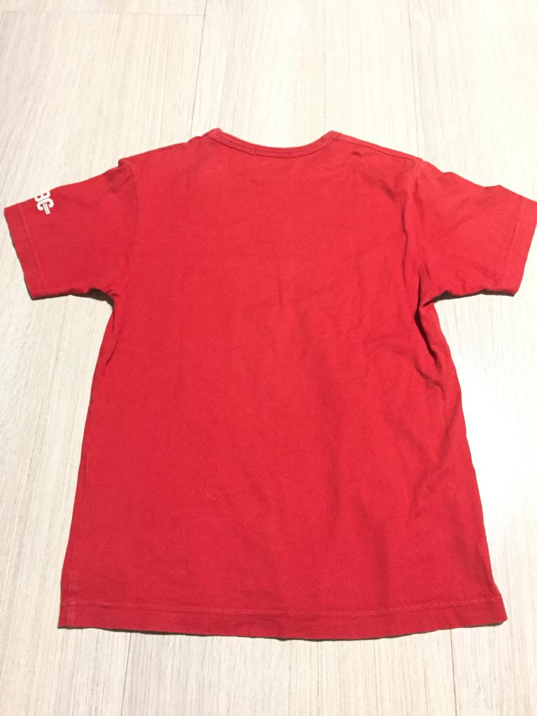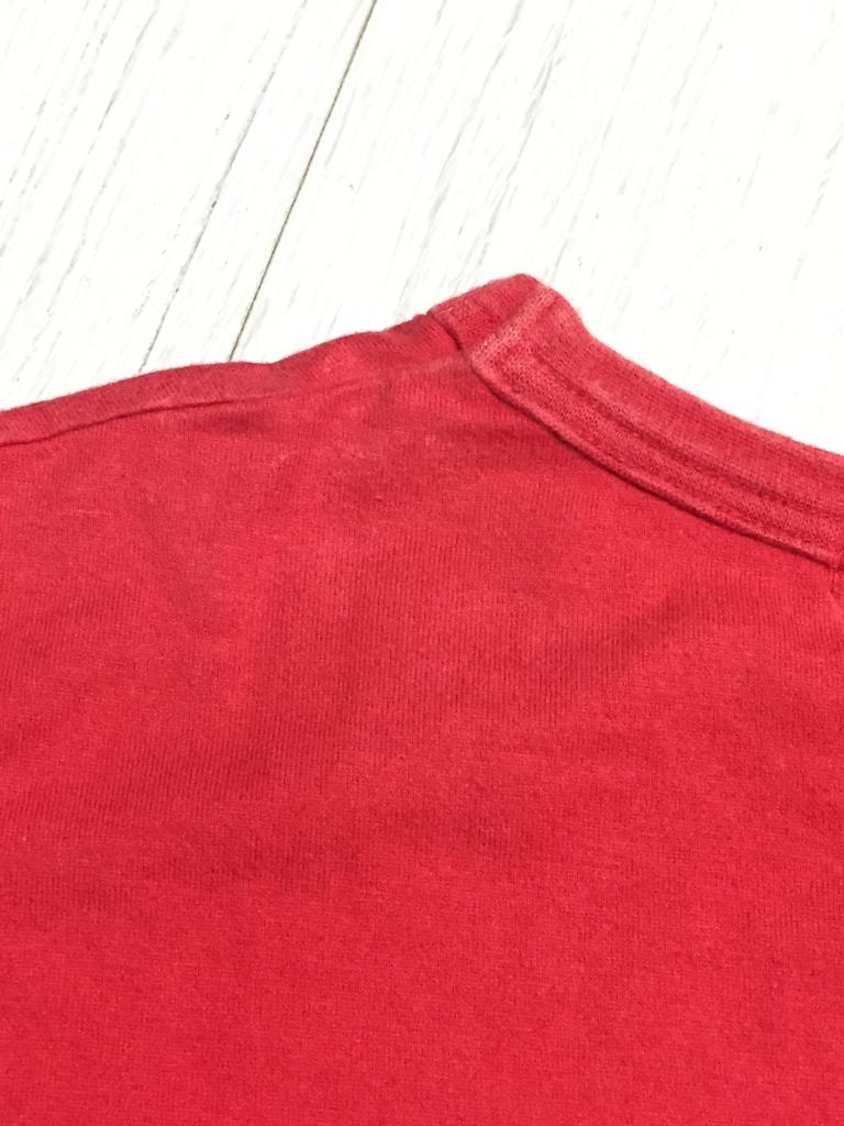 ブルークロス 【記載サイズ】M 【実寸(㎝)】胸囲84 着丈58 肩幅39 袖丈17 【素材(%)】 【色・素材感】赤 かすれプリント 裾にパッチ 【デザイン等】プリント 【状態】色あせ 汚れ 左裾側 毛羽立ち 毛玉 右袖 右胸汚れ タグカットの為素材不明 |