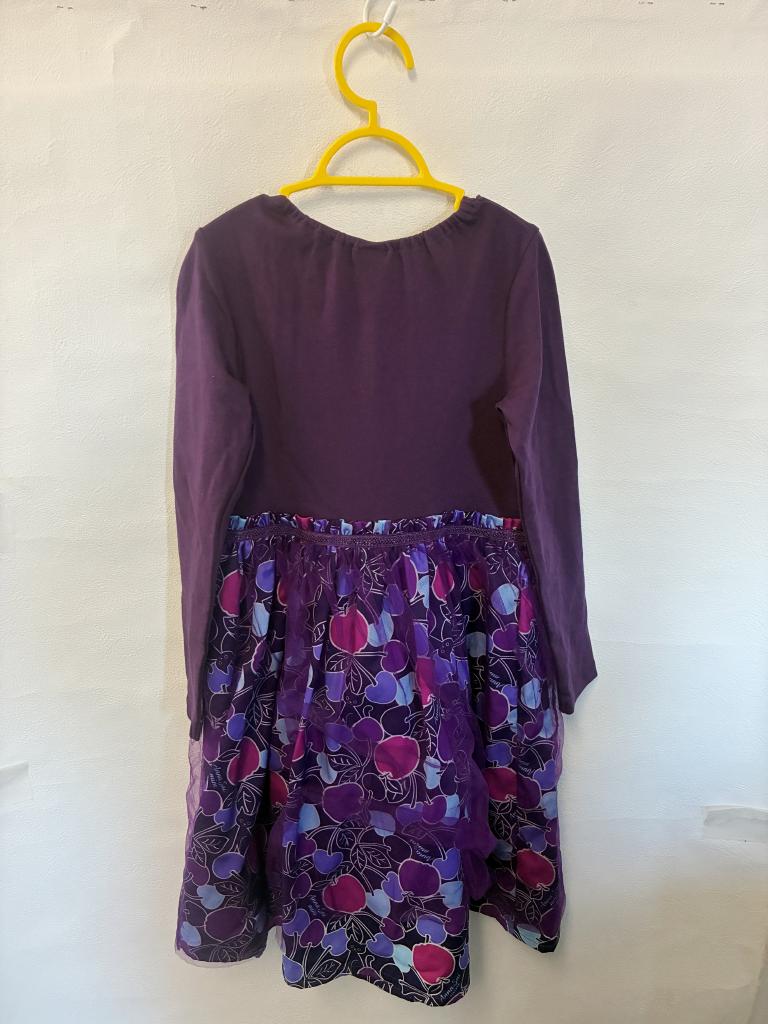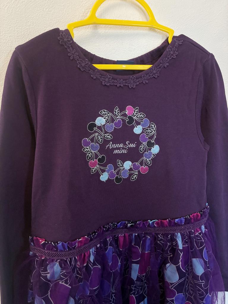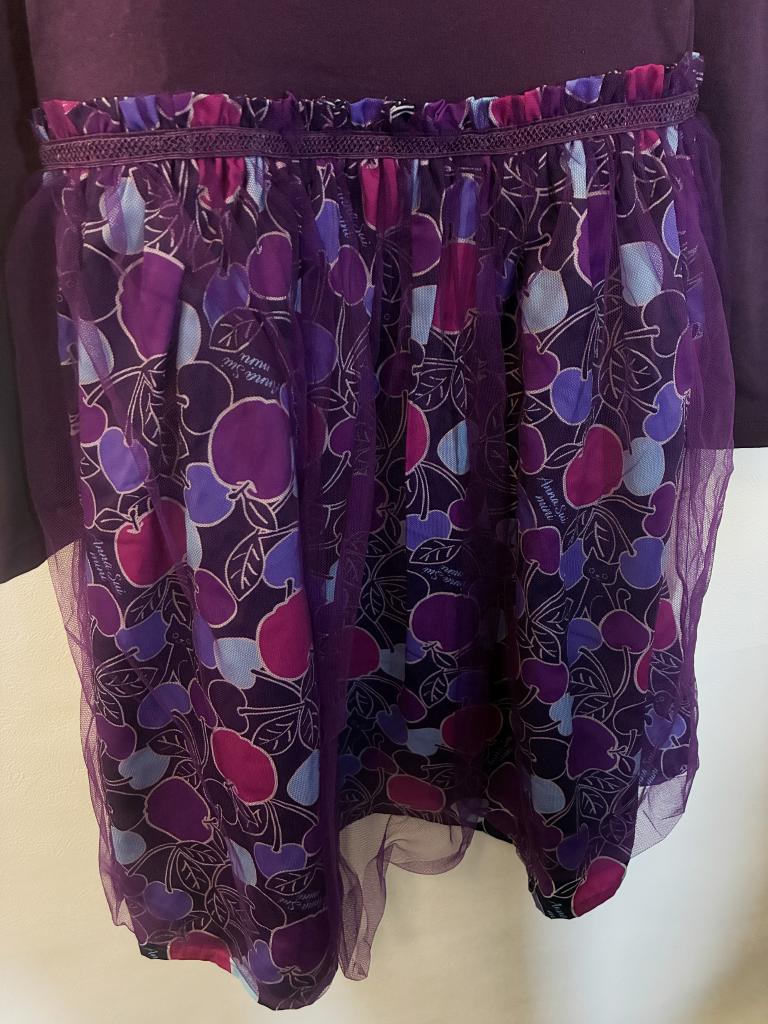 【評価】3 【サイズ】130 【実寸】身幅32 着丈71 袖丈46.5 肩幅27 【材質】(上身頃)綿100% レース部分:綿100%(スカート)チュール部分:ナイロン100% 柄部分:ポリエステル100% 無地部分:ポリエステル88% 綿11% 【状態】着用感…少々 上身頃:毛羽立ち・色褪せ…少々 【色・デザイン】パープル 首周り後ろゴム |