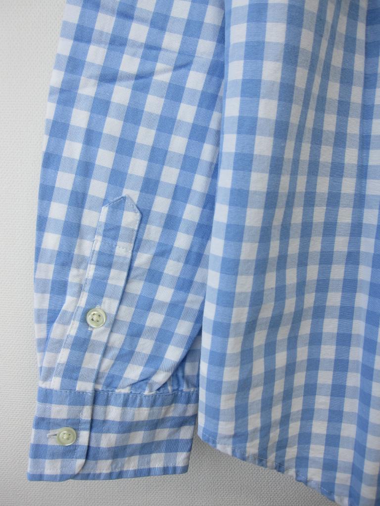 【ゆうパケット可能】 【サイズ表記】L/G(14-16) 【材質】レーヨン・麻混 【実寸サイズ】肩幅39身幅47.5袖丈56.5着丈62 【デザイン】水色×オフホワイト、ギンガムチェック ポニー刺しゅう チェックシャツ ボタンダウン ラルフローレン(株) 前・袖口ボタン 【状態】右袖後ろ薄茶シミ4㎜ 左袖後ろ薄い青点(元々の生地色ムラ?)×3ヵ所 右袖前薄い青点×1 着用感・色あせ中くらい |