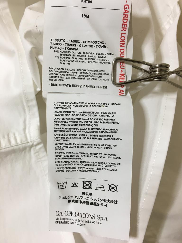 | コメント | 【ジョルジオアルマーニジャパン社】 表示サイズ:82 ホワイト 前全開ボタン 襟内側に黄ばみ中程度 着丈33 身幅28 |