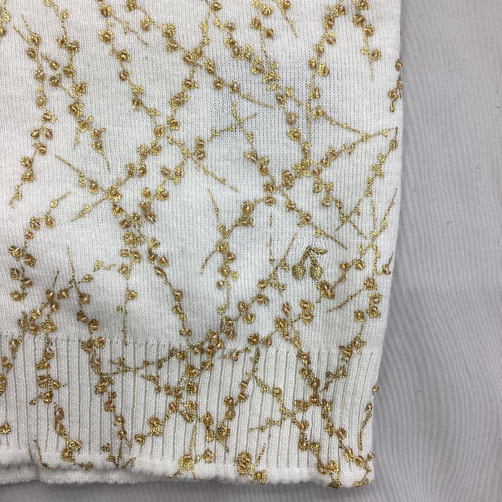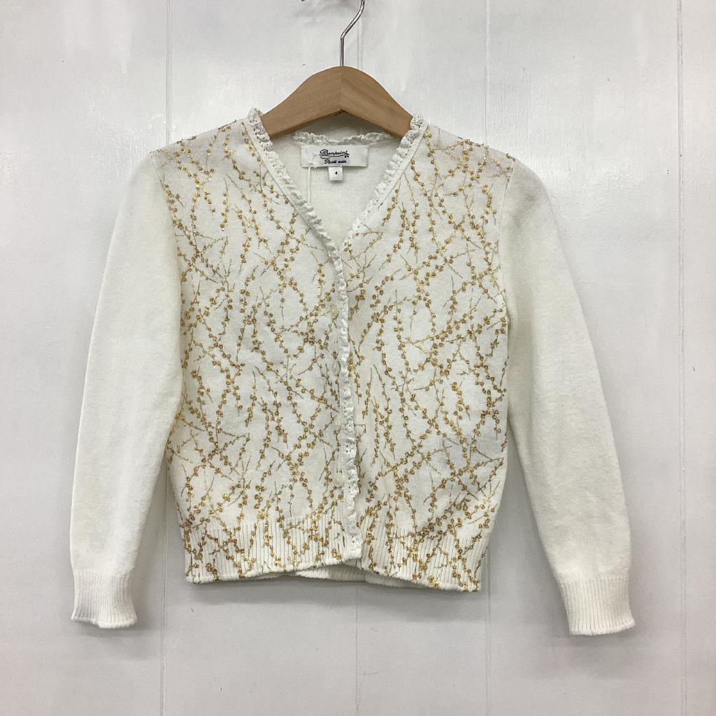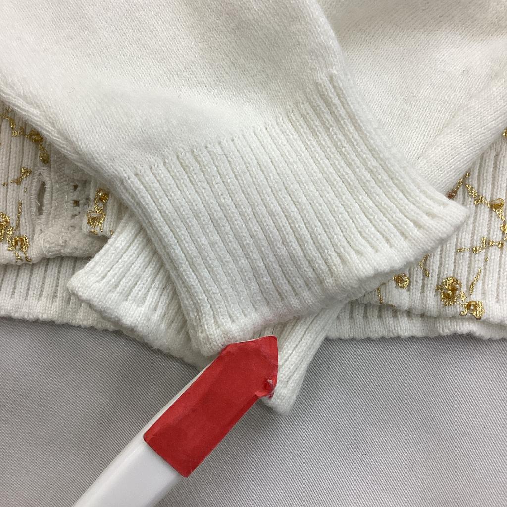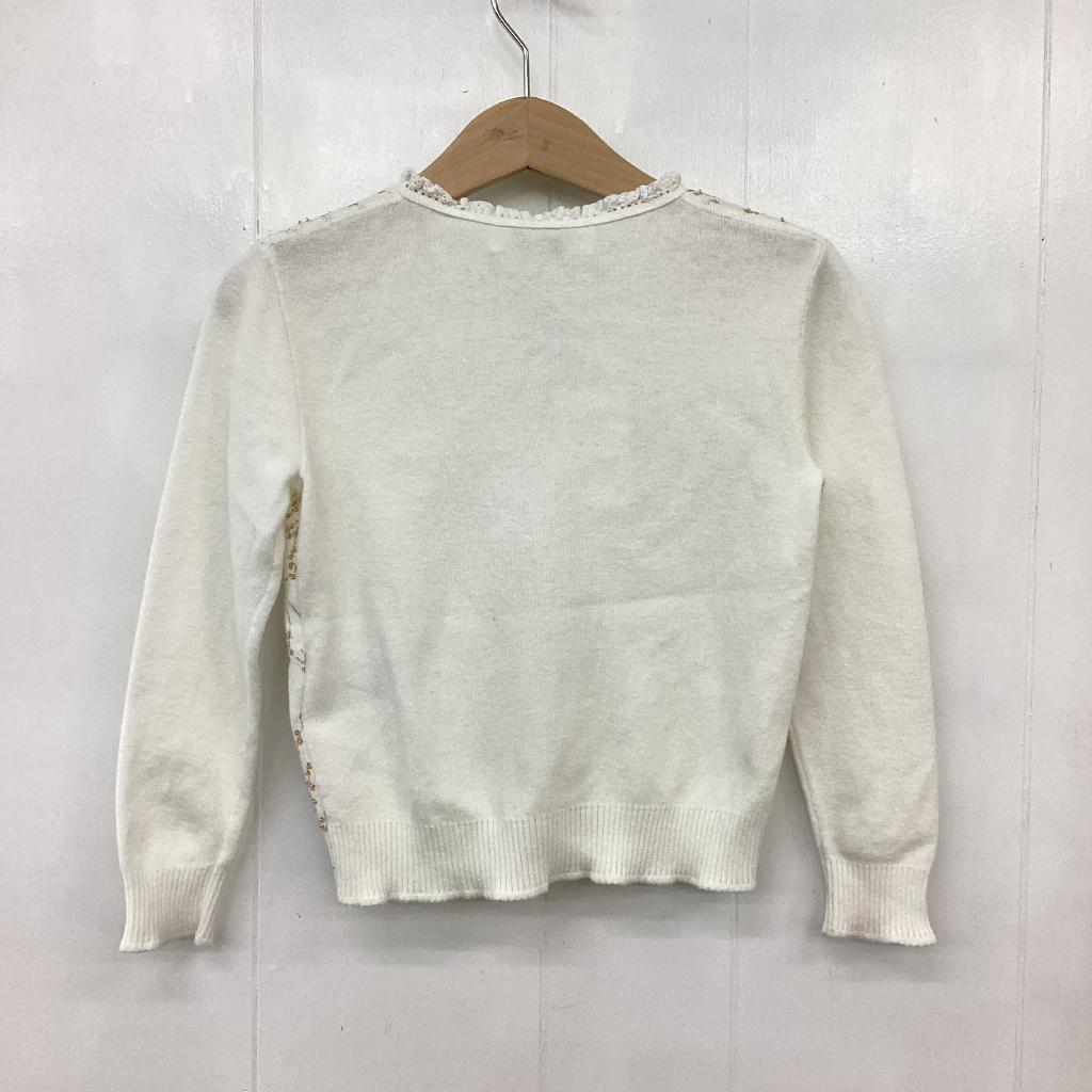 【サイズ】100cm 【実寸(㎝)】身幅31.5 袖丈36 肩幅28 丈35 【素材(%)】※タグ参照 【裏地(%)】なし 【色】ホワイト系 【デザイン】サイズ表記:4 前ボタン 襟ぐりから前縦レース縫い付け 前身頃ラメプリント ビーズ縫い付け 左前裾刺しゅう オフホワイト 綿ニットカーディガン 【状態】使用感あり(中) 袖口色汚れあり シミあり |