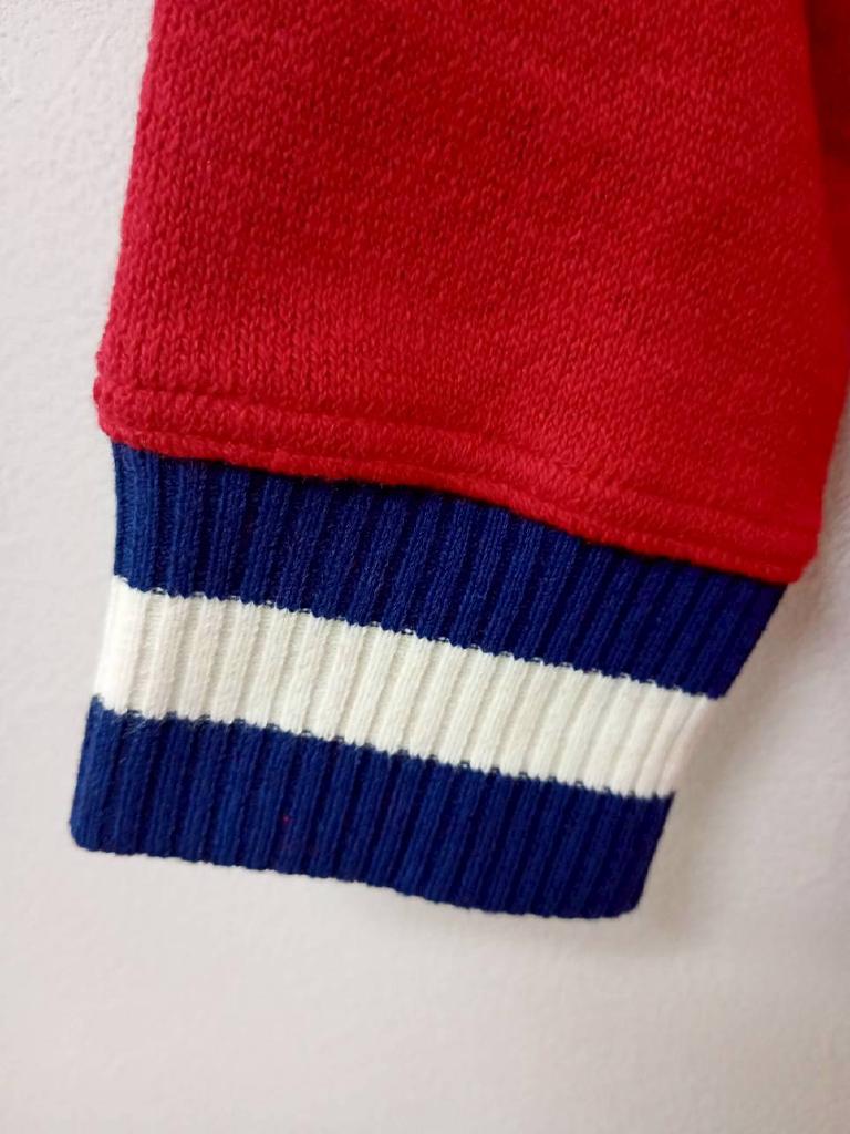 定価13000円+税の品 【メーカーサイズ】110 身長105~115 B56-W52 【実寸(cm)】身幅36.5 着丈41 袖丈30 【素材】本体:綿 ポリエステル リブ部分:綿 ポリウレタン 【デザイン・色】赤 黄 青等 ニット地 袖リブ |