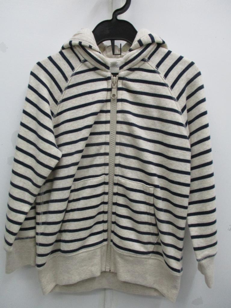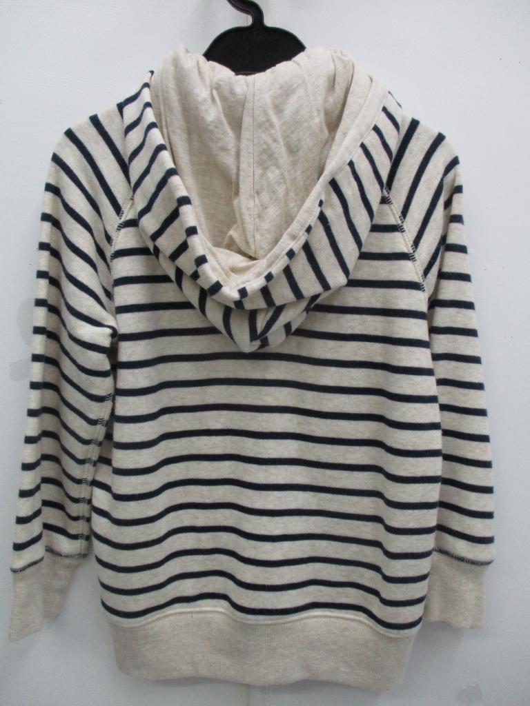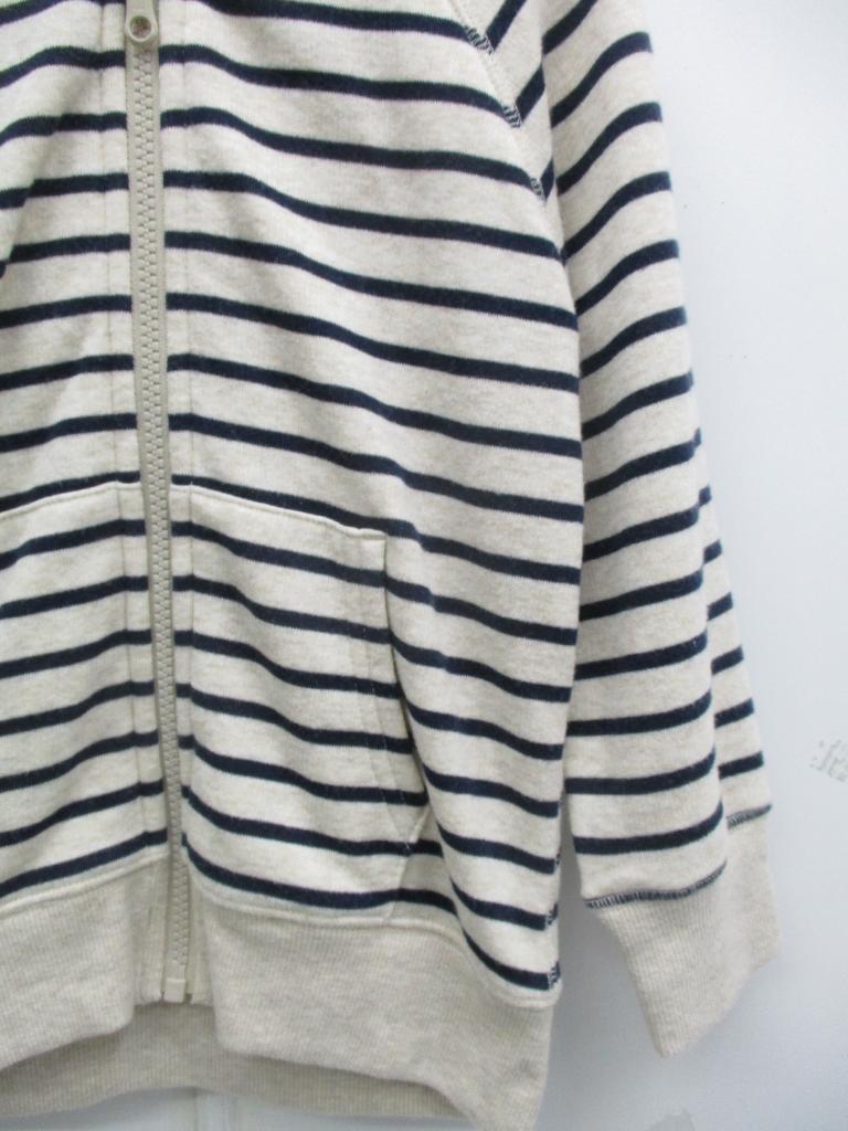 ★ボーダー柄♪ 【材質】綿86 ポリエステル14 【生地説明】トレーナー地/裏パイル地 【実寸】身丈43 身幅34 ラグラン袖丈53 【色、柄】ベージュー×黒ボーダー 【デザイン、特徴】フード一体型 前ファスナー ポケット前×2 袖口、裾リブ地。 【状態】目立った汚れなし 【※クリックポスト発送不可】 |