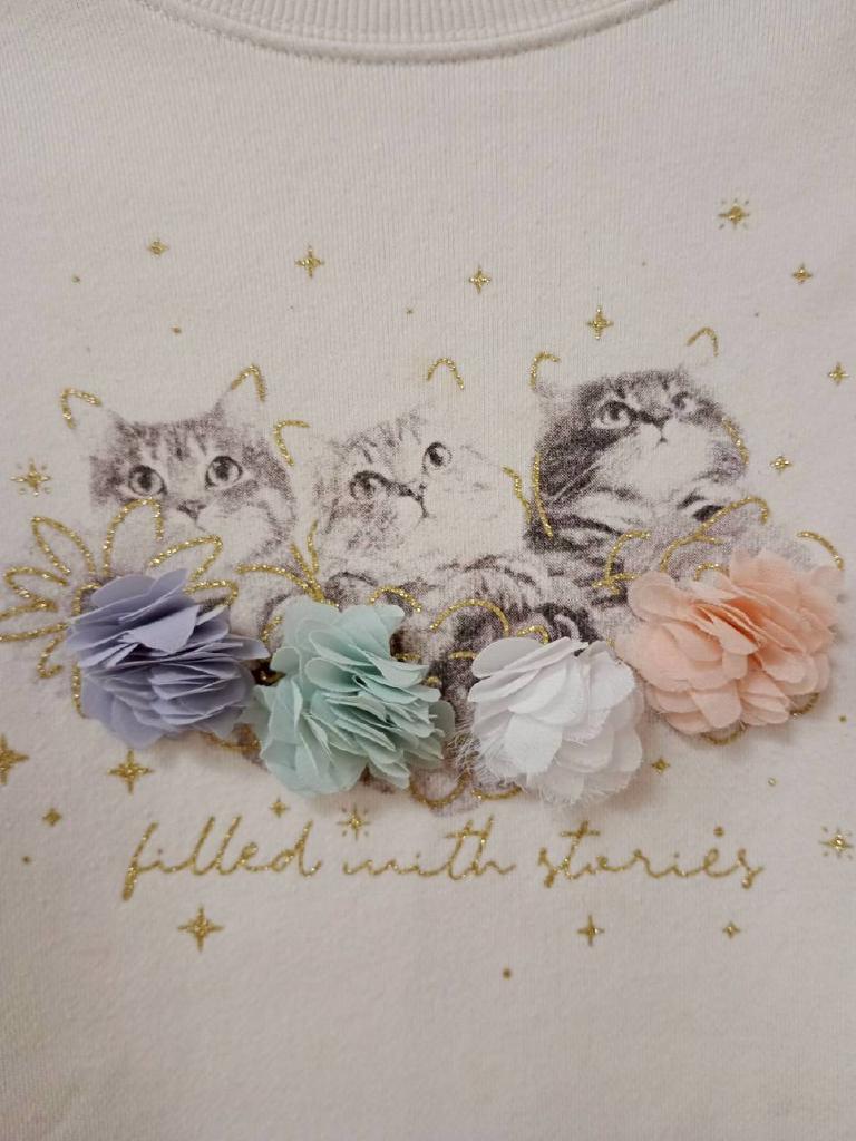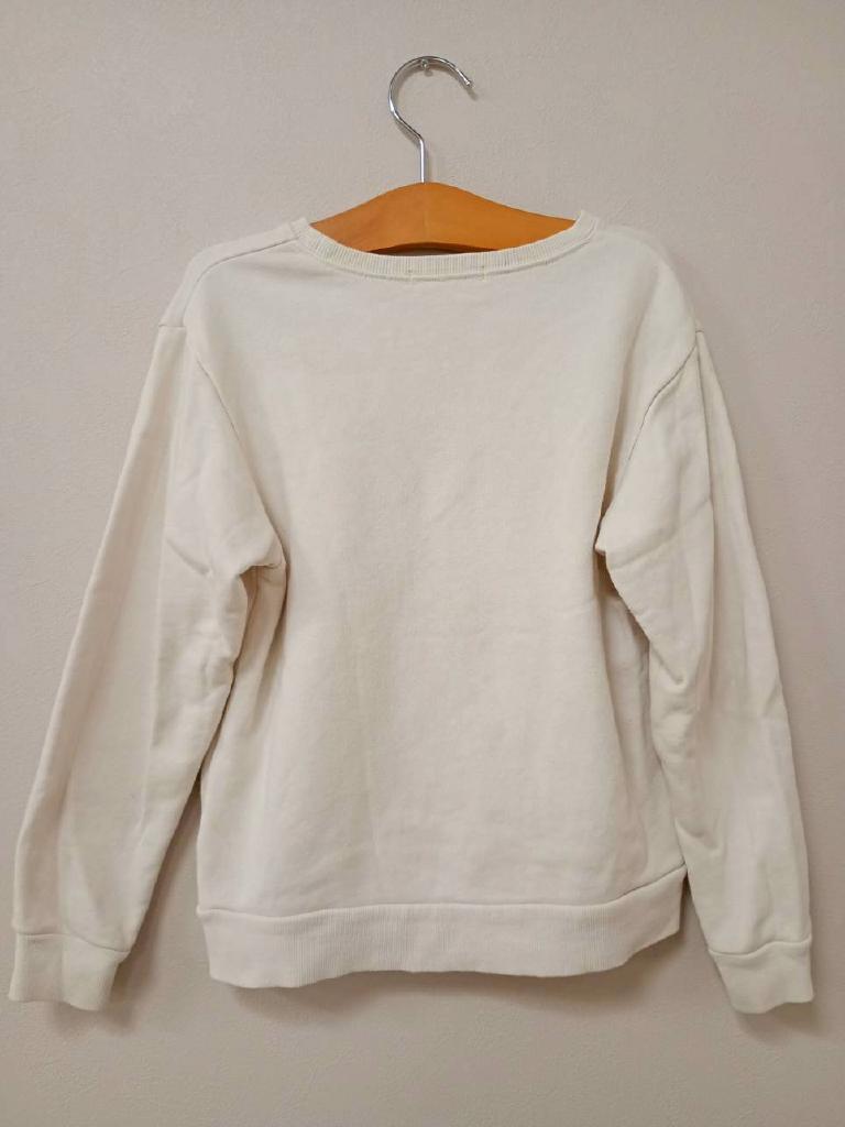 【メーカーサイズ】130 【実寸(cm)】身幅37 着丈44.5 袖丈42.5 【素材】本体:綿 リブ:綿 ポリウレタン 【デザイン・色】オフホワイト トレーナー地 前プリント 立体の花・ゴールドラメ 【状態】少々毛羽立ち・毛玉・くすみ 前薄い汚れ タグに記名あり(少しベタベタ) |