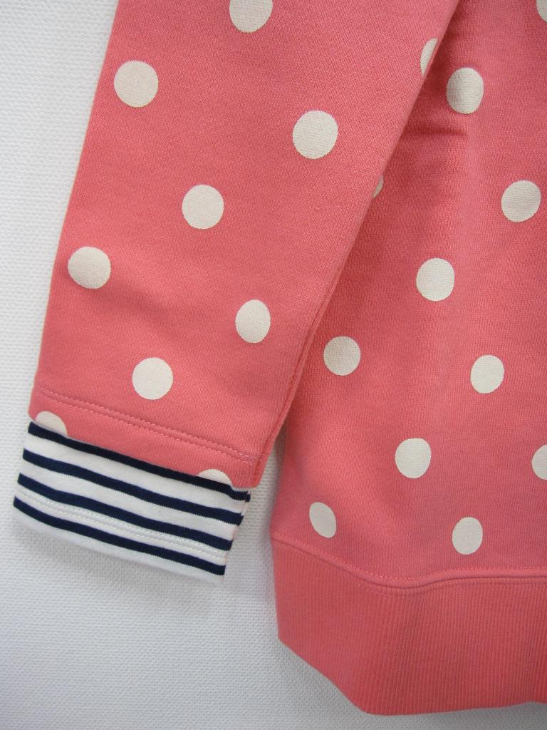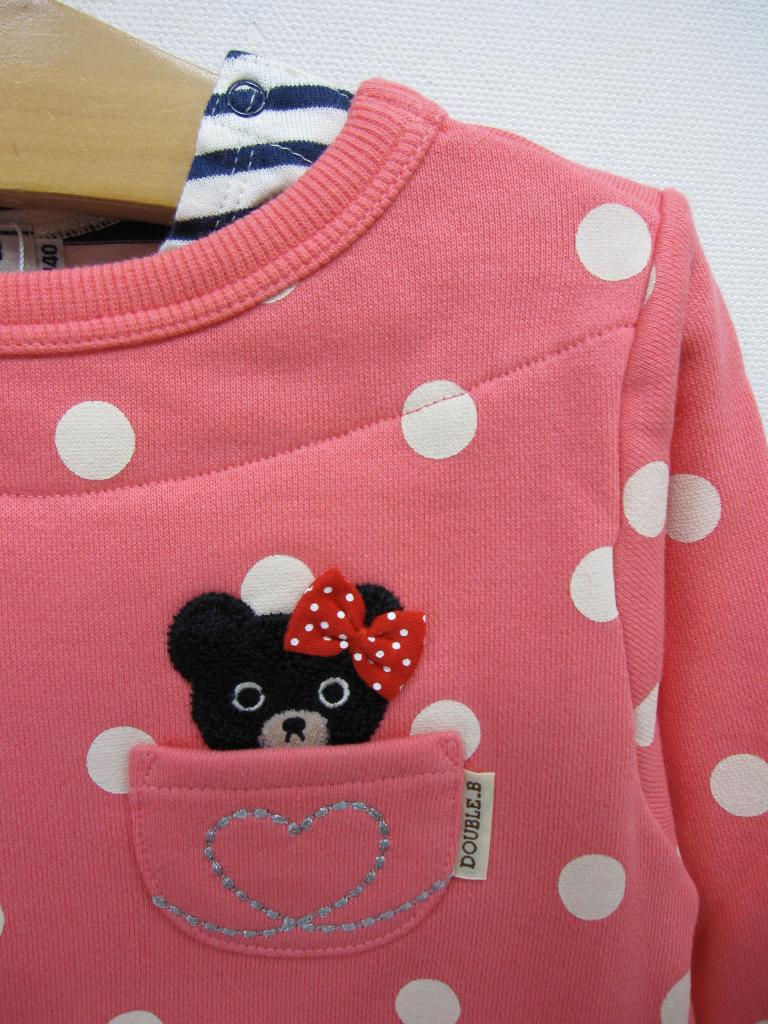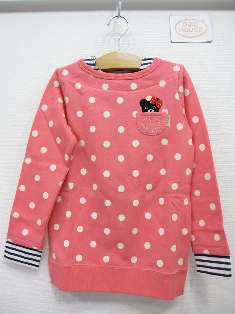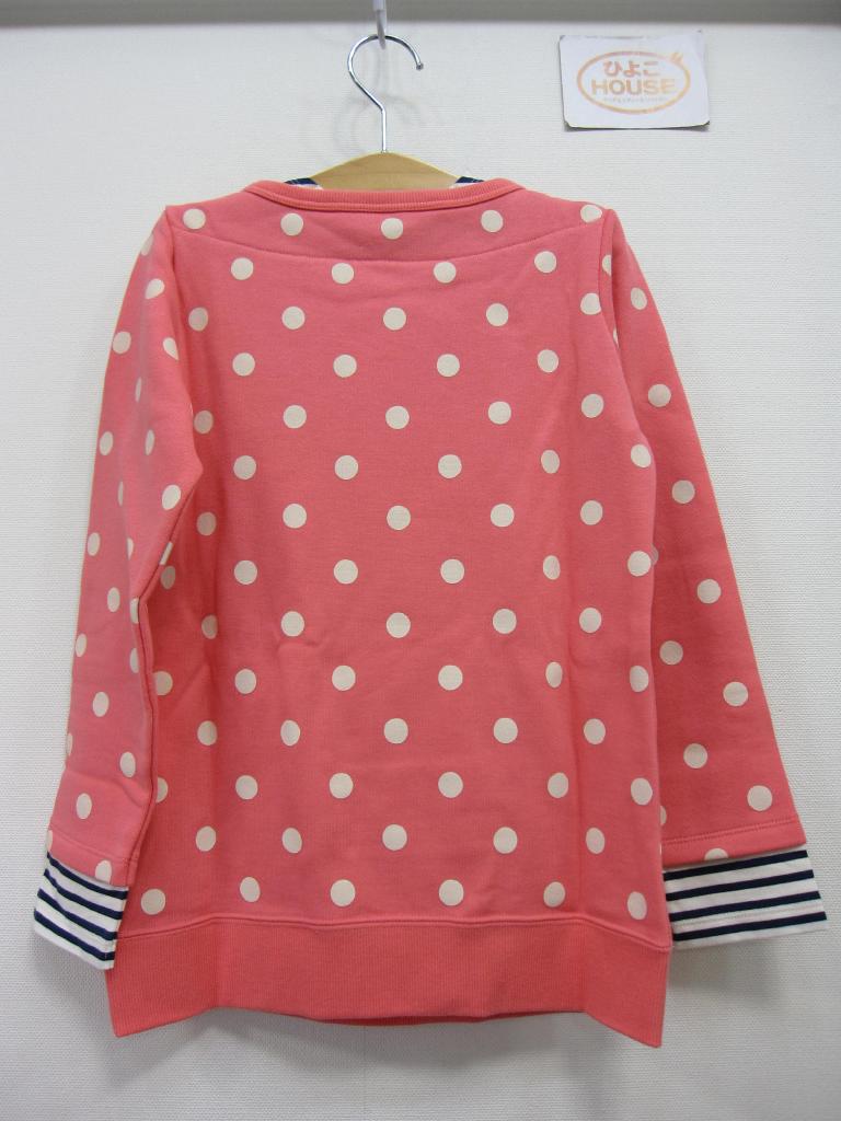 【材質】写真参照 【実寸サイズ】身幅38着丈53 【デザイン】ピンク×ドット ネイビーボーダーとの重ね着風スウェット B子ちゃんアップリケ 日本製 トレーナー地 裏地:パイル 定価11,550円(税込) |
