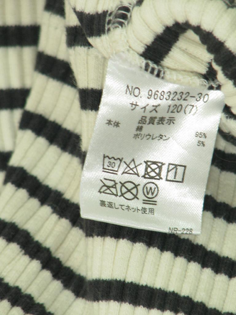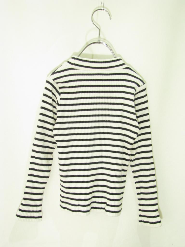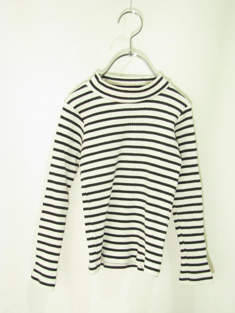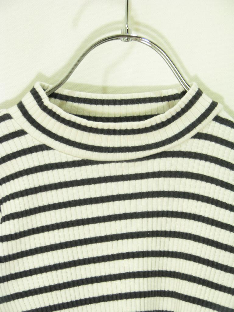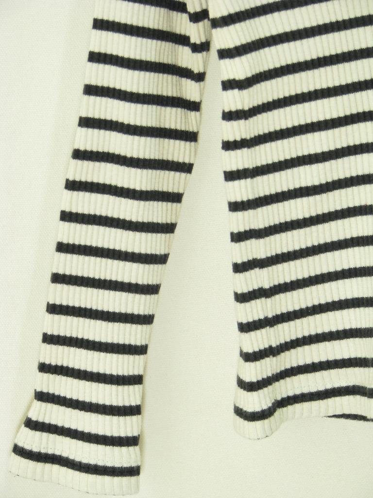 【実寸(cm)】着丈39 身幅25.5 肩幅24.5 袖丈40 【色】オフ白×黒ボーダー 【デザイン】リブ 【状態】少々毛羽立ち |