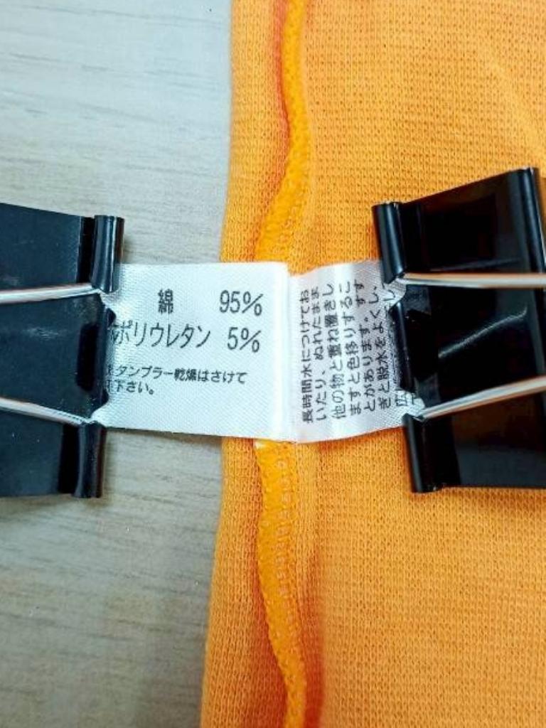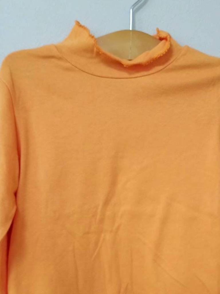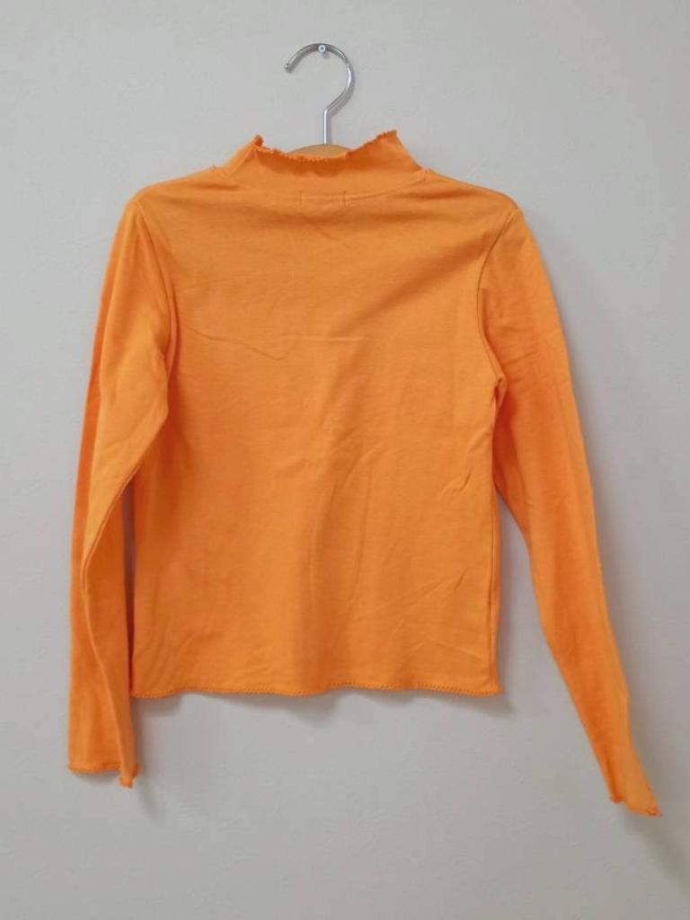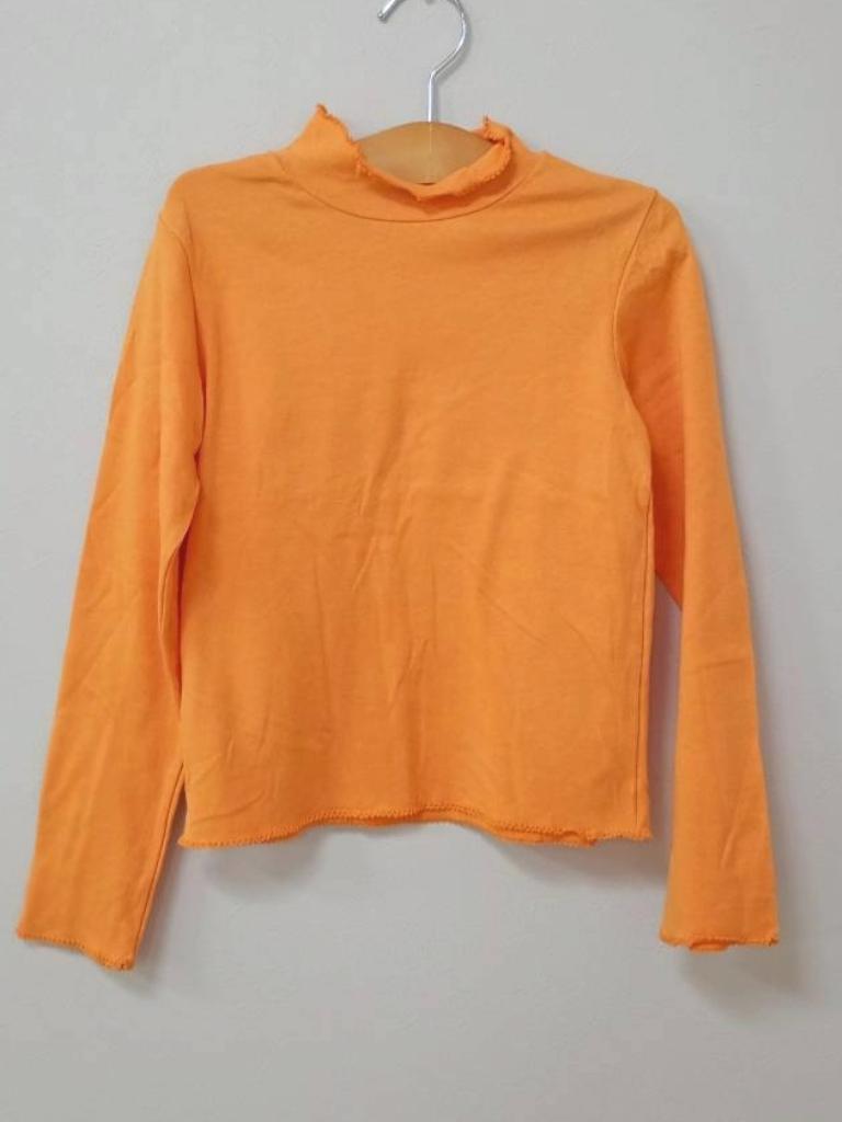 【メーカーサイズ】130 【実寸(cm)】身幅32.5 着丈39 袖丈45 【素材】綿 ポリウレタン 【デザイン・色】オレンジ 薄手 タートルネック 【状態】少々毛羽立ち |