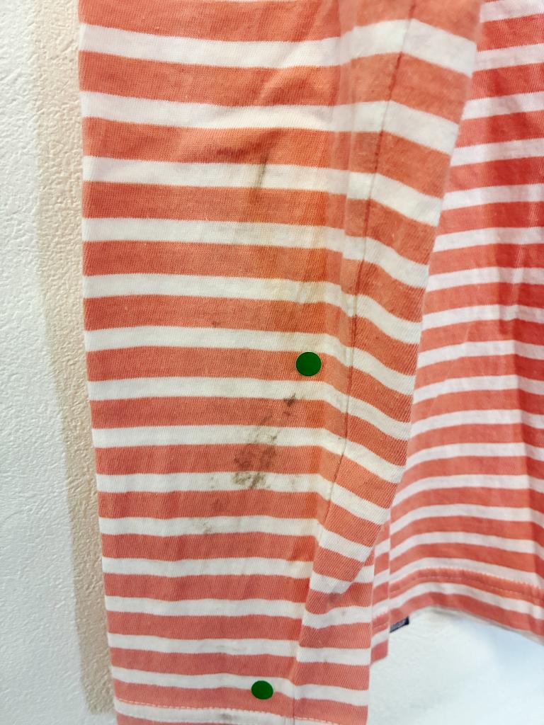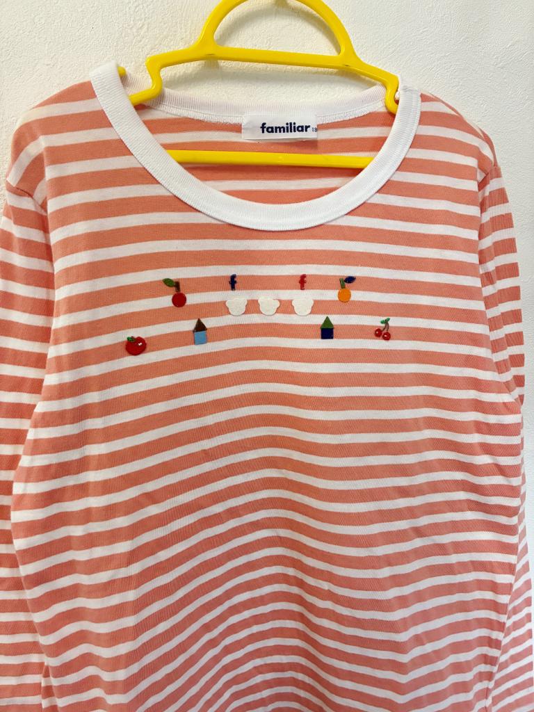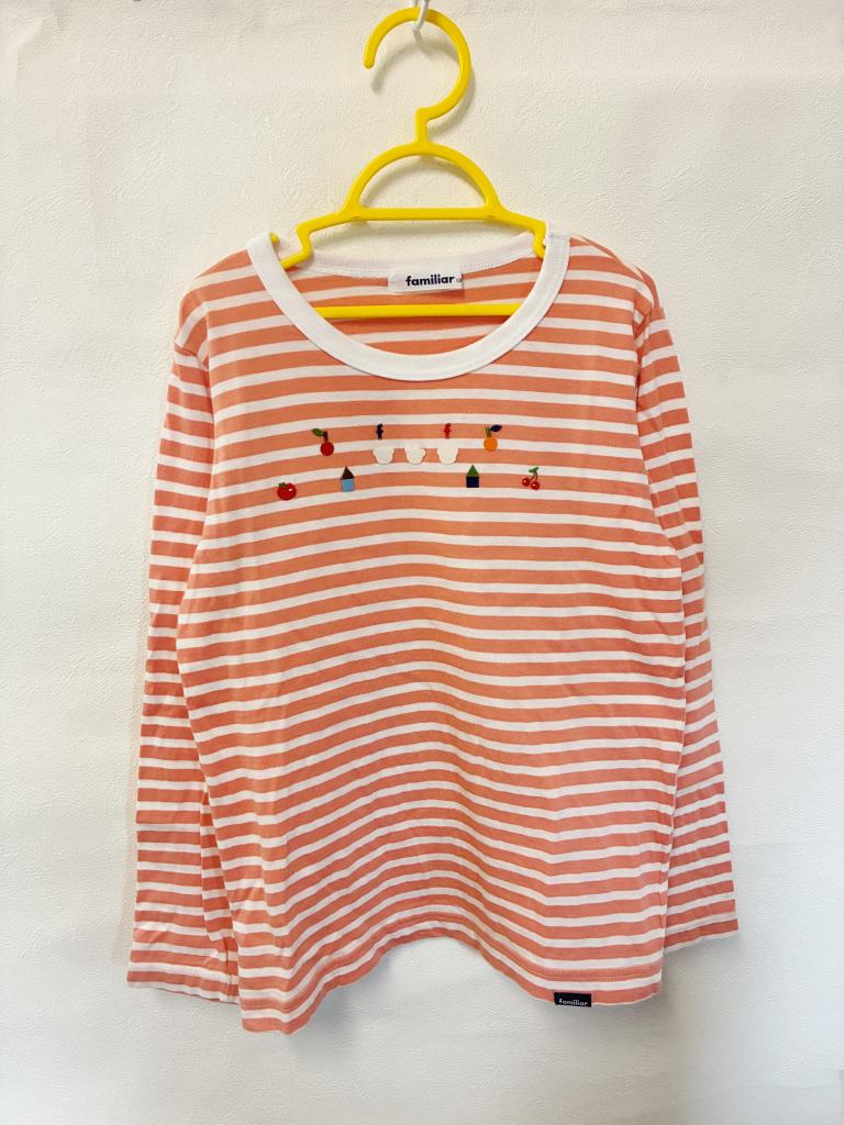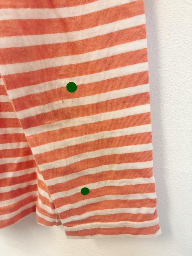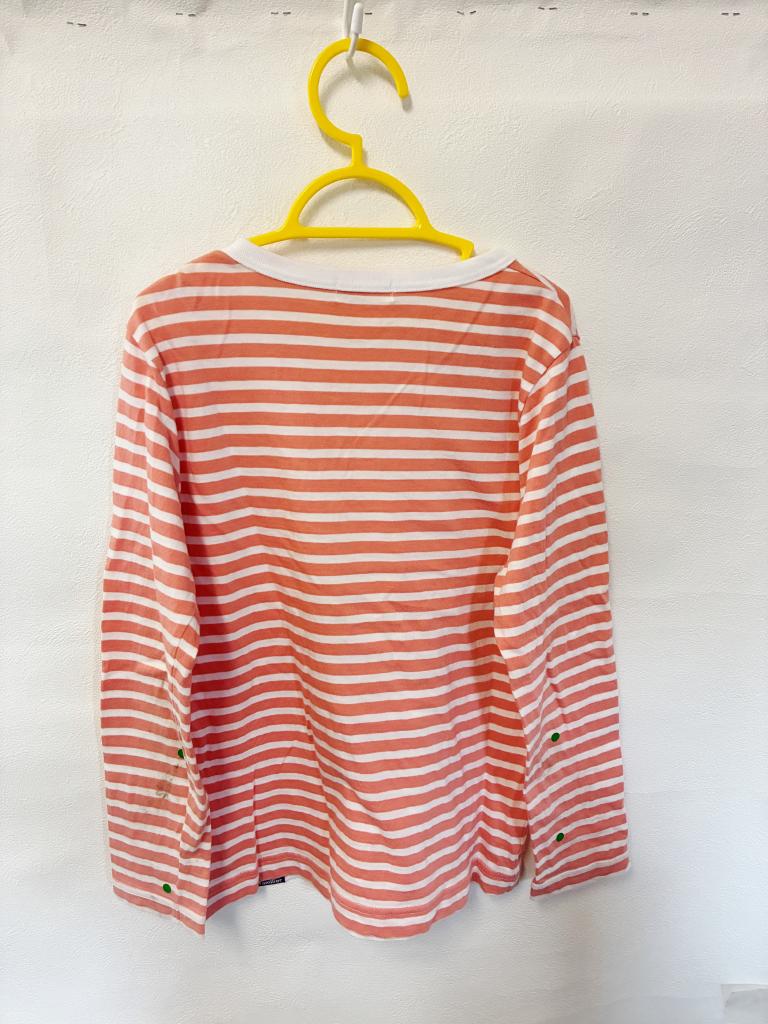 【評価】2 【サイズ】130 【実寸】身幅36 着丈46 袖丈45 肩幅31 【材質】綿100%(衿ぐり部分)綿70% ポリエステル30% 【状態】毛羽出し・生地よれ…少々 着用感…やや大 袖:汚れ…やや大 【色・デザイン】サーモンピンク×ホワイトのボーダー柄 |