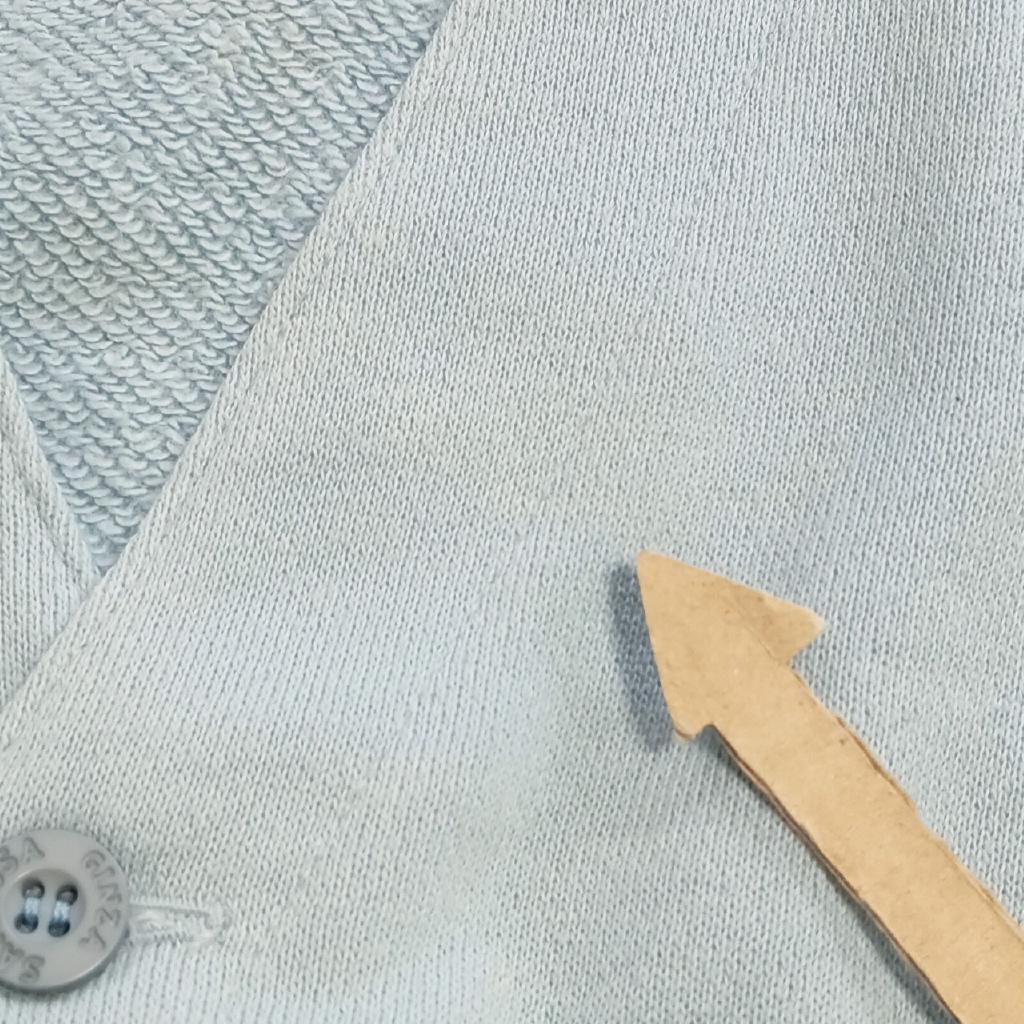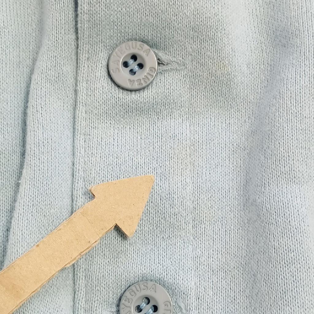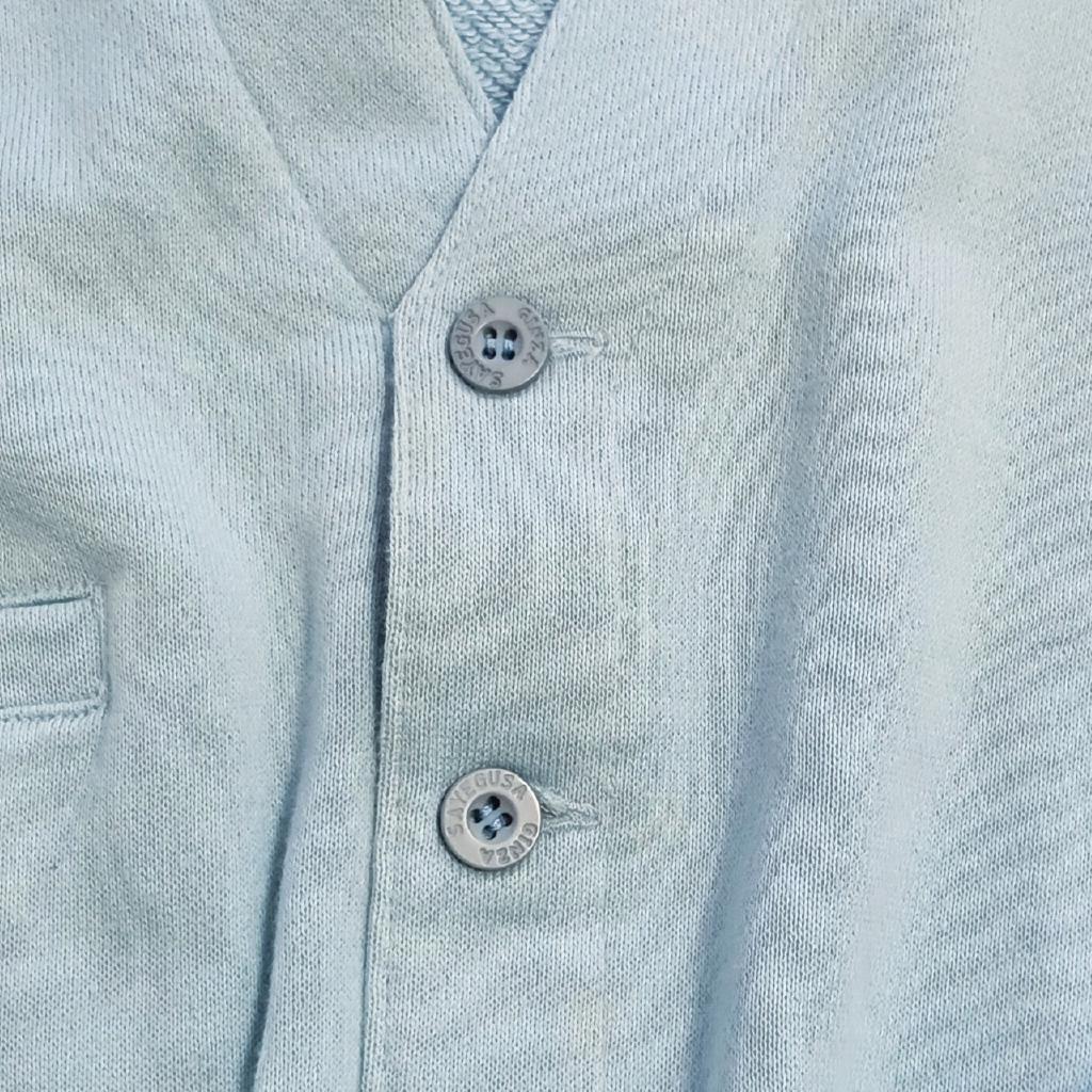 【素材】写真参照 【実寸(cm)】3/100A 着丈39 身幅37.5 【色・デザイン】水色 左胸元にワンポイント刺繍 右側にポケット 前ボタン 【状態】前薄いシミあり |
