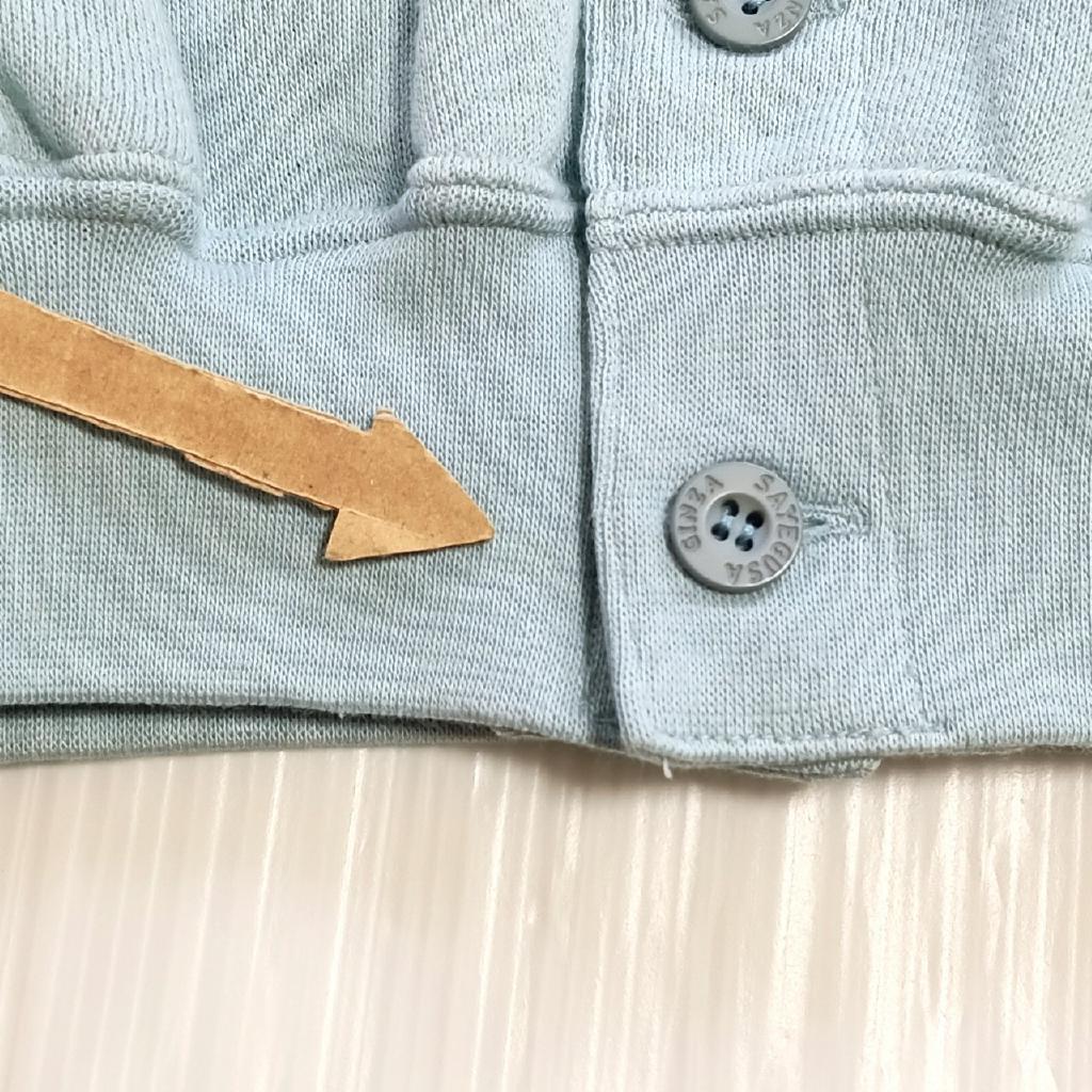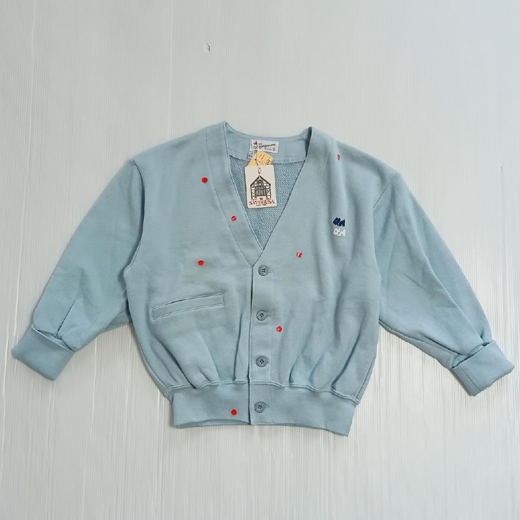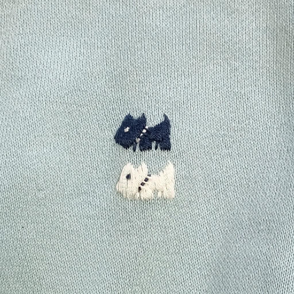 【素材】写真参照 【実寸(cm)】3/100A 着丈39 身幅37.5 【色・デザイン】水色 左胸元にワンポイント刺繍 右側にポケット 前ボタン 【状態】前薄いシミあり |