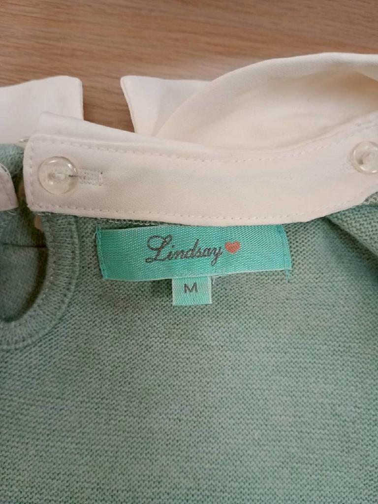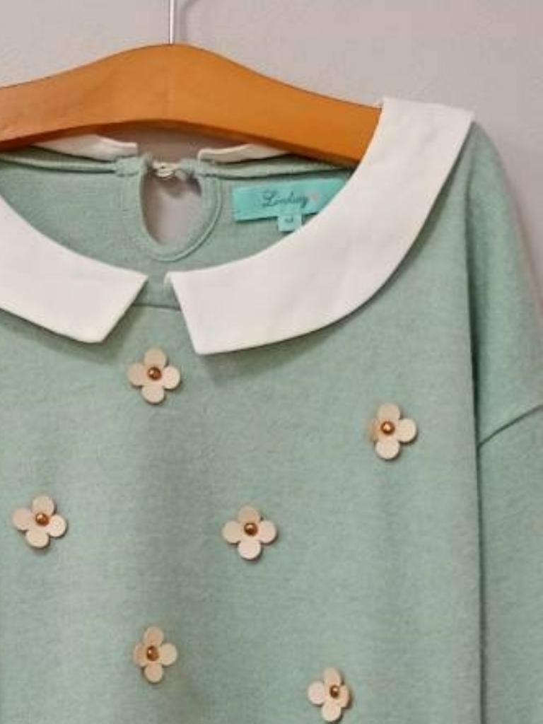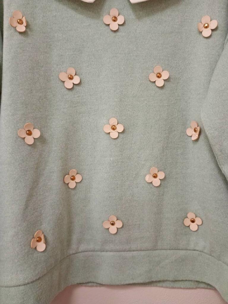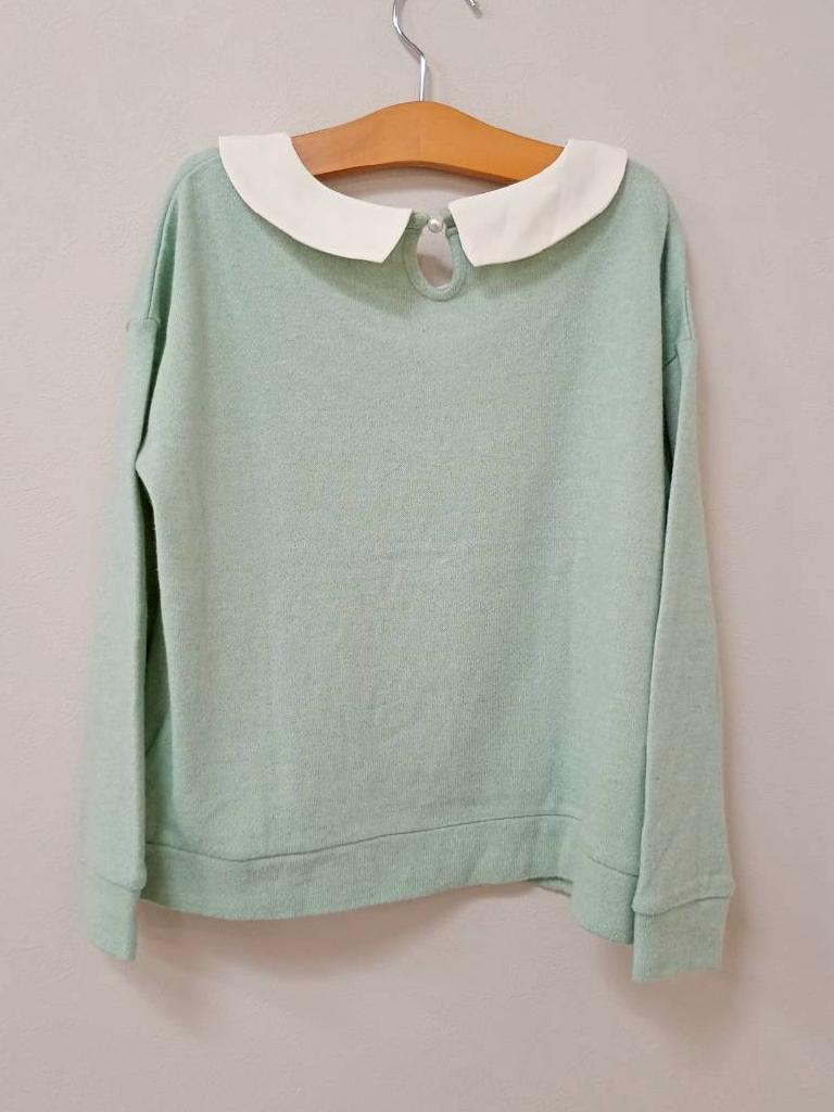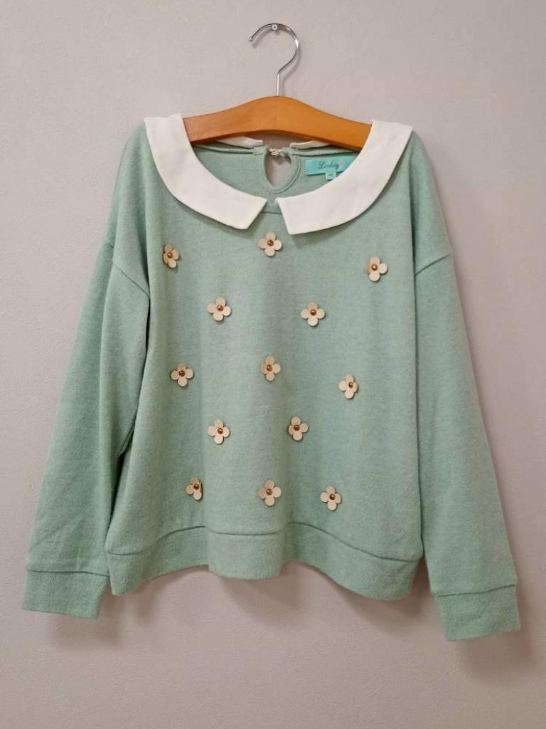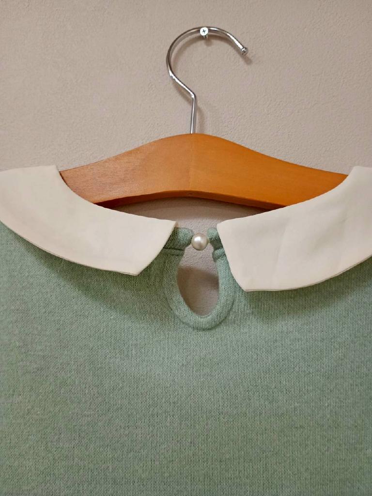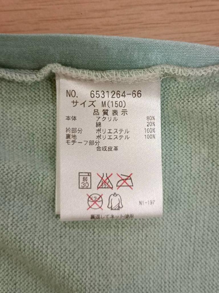 【メーカーサイズ】M(150) 【実寸(cm)】身幅46.5 着丈45 袖丈39 【素材】写真参照 【デザイン・色】淡い緑 白 前花飾り つけ衿 【状態】少々毛羽立ち |