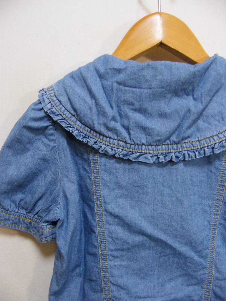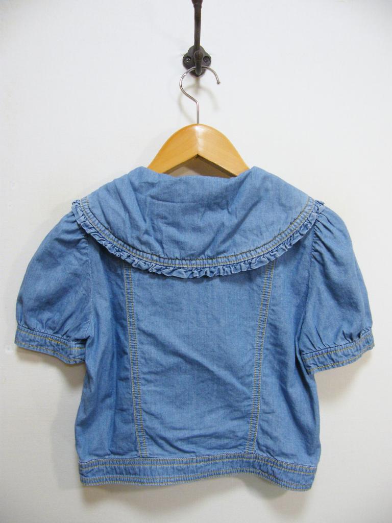 | コメント | 【色柄・デザイン】ブルー系色 ラメ入りししゅうロゴ フリルえり 前フルスナップどめ 【商品状態】毛羽立ち少々 着用感少し【実寸サイズ(約センチ)】身幅35 袖丈19 肩幅27.5 着丈34 ◆メール便OKサイズ※『代引』お支払は「不可」です◆ |