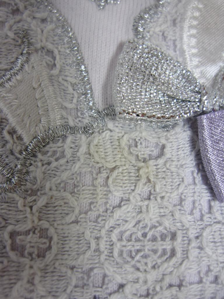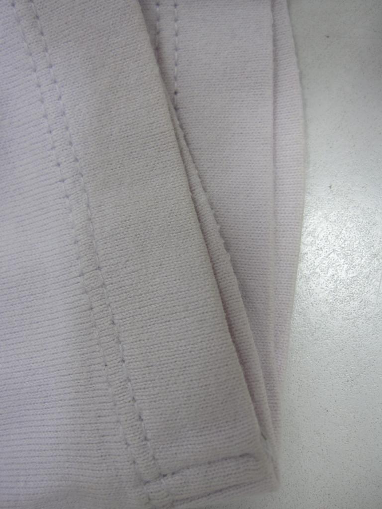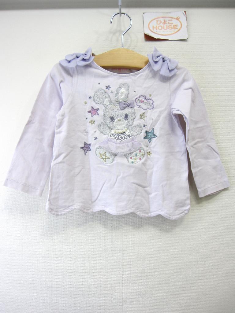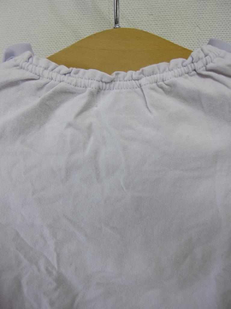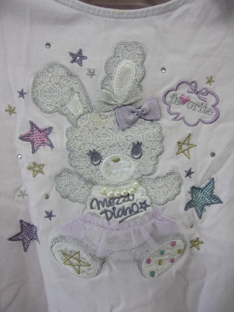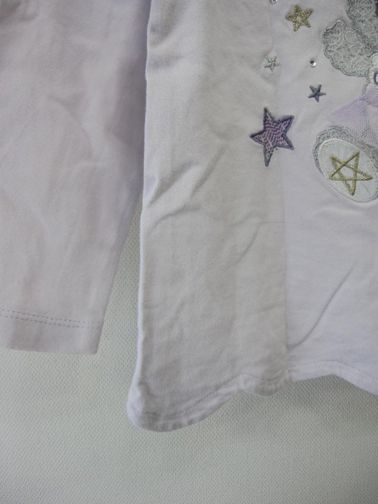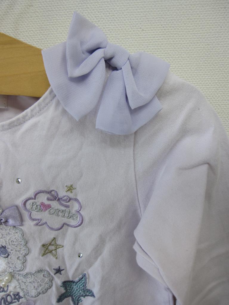 【ゆうパケット可能】 【材質】写真参照 【実寸サイズ】肩幅23身幅31袖丈33.5着丈35 【デザイン】淡いラベンダーピンク ウサギレース長袖Tシャツ 首後ろゴム入り 肩リボン 【状態】ウサギに茶しみ1.5㎝ 前首、袖口に薄茶シミ、汚れあり 着用感・色あせ・毛羽立ち中くらい 定価9,790円(税込) |