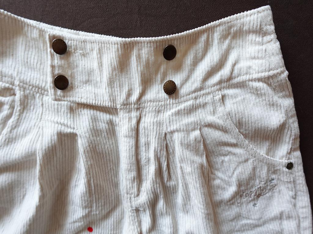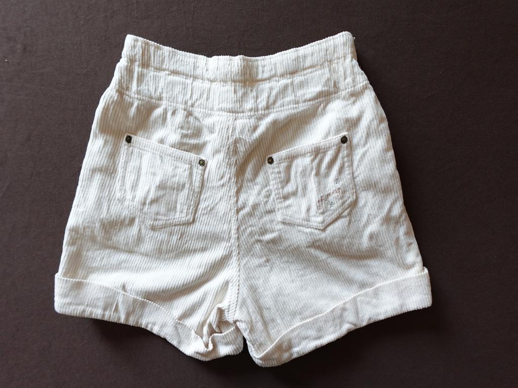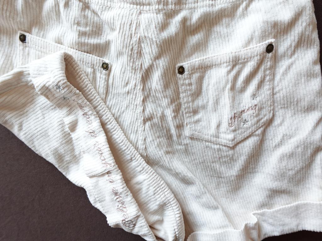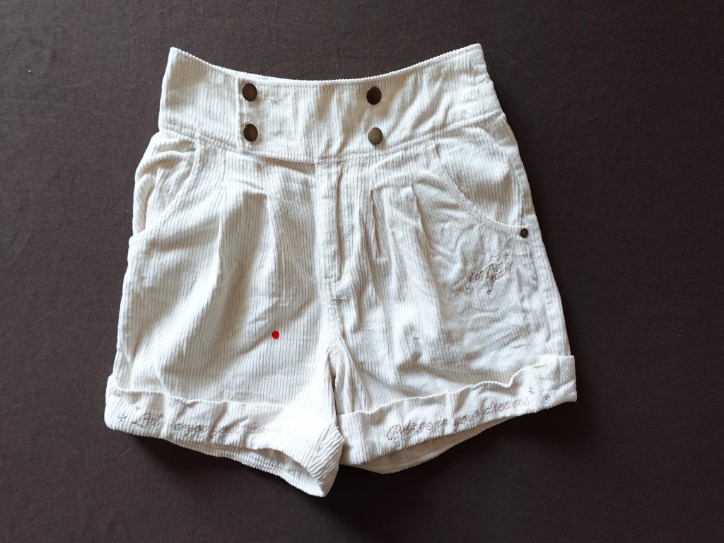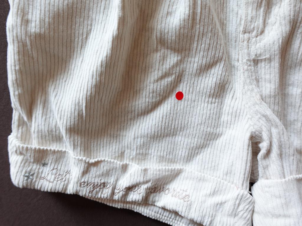 | コメント | ストレッチ コーデュロイ ロゴの刺しゅう ウエストアジャスター 前ファスナー・スナップ 前後ポケット 色あせ・毛羽立ち少々 前に、点シミ 実寸サイズ:ウエスト~63cm/股下10cm |