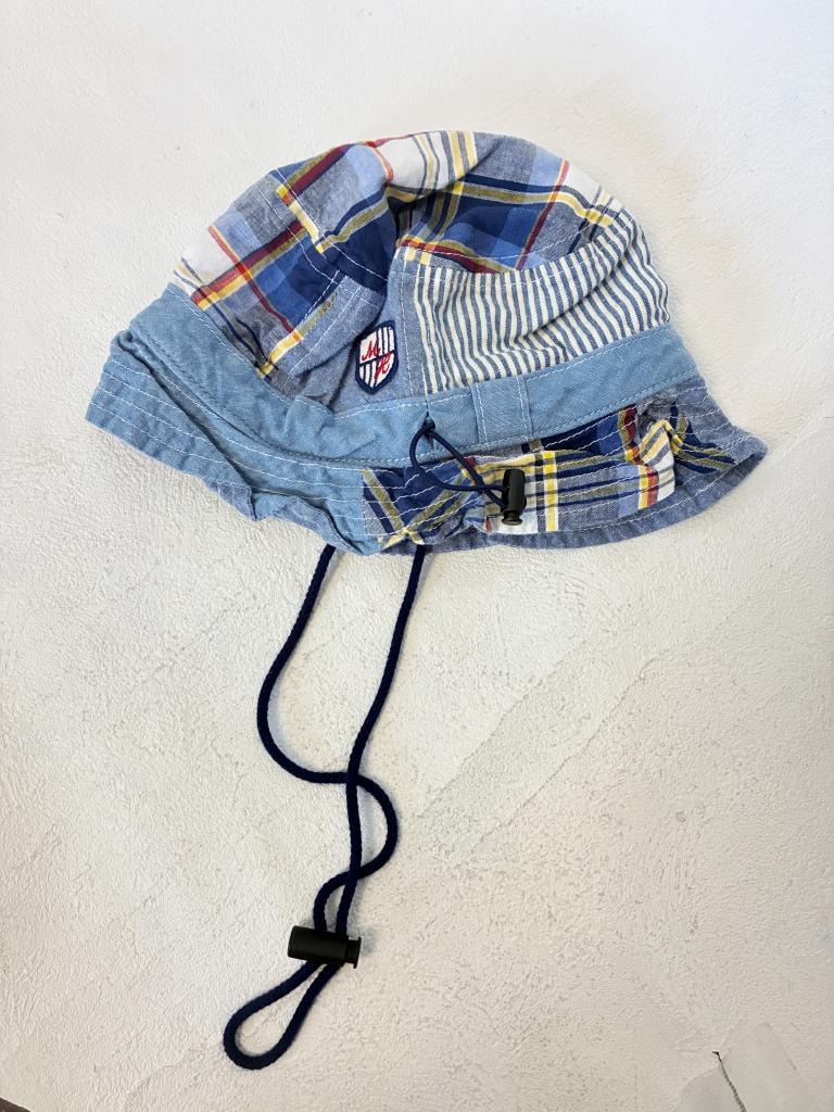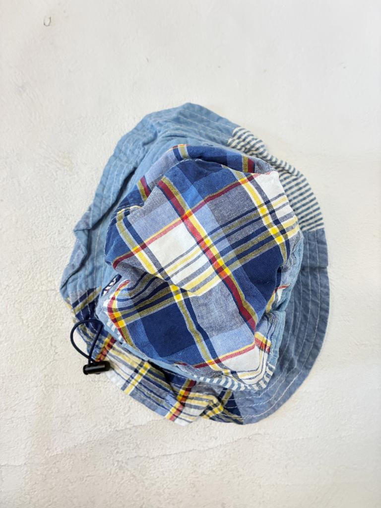 【評価】3 【サイズ】S/48-50㎝ 【実寸】縦25 横23 高さ8 内径50 【材質】(格子)綿85% 麻15%(無地・ストライプ)綿100% 【状態】毛羽立ち・使用感…少々 【色・デザイン】ブルー 無地×ストライプ×チェック柄 ドローコードあり |