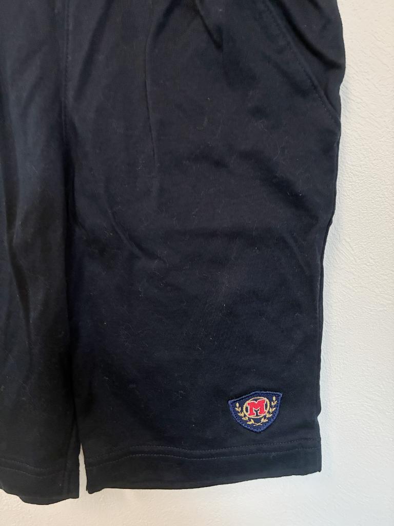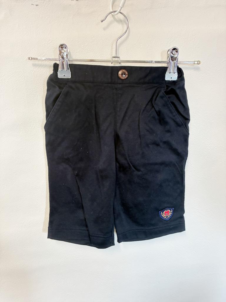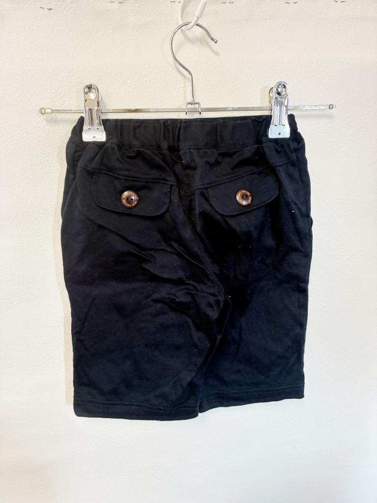 【評価】3 【サイズ】100 【実寸】ウエスト幅21 股上20 股下17 【材質】綿100% 【状態】毛羽立ち・着用感…少々 【色・デザイン】ネイビー 前左右ポケット ウエスト後ろゴム 飾り:後ろ左右ポケット 6分丈 |