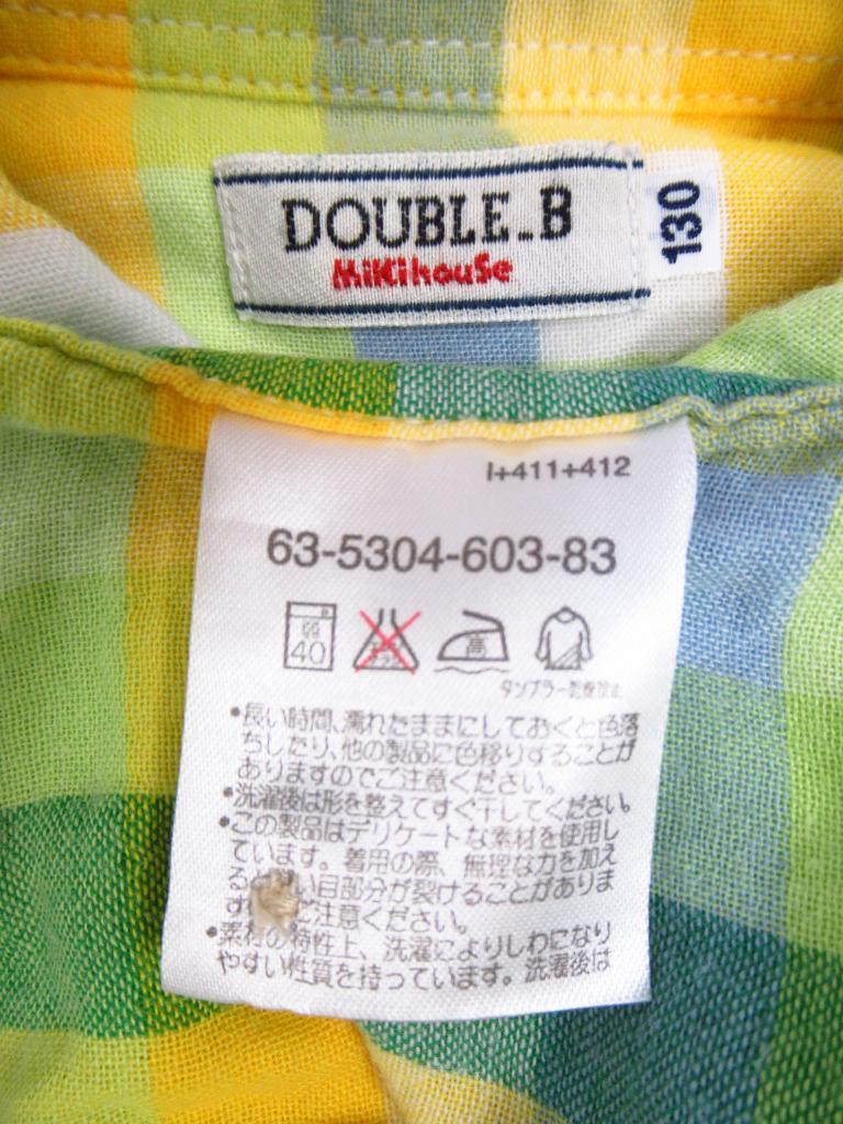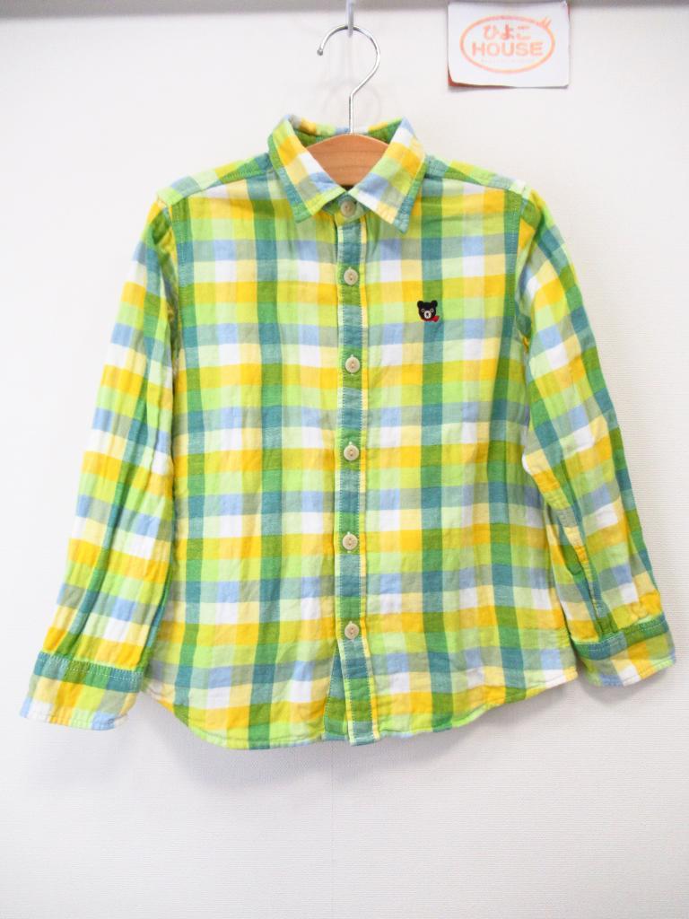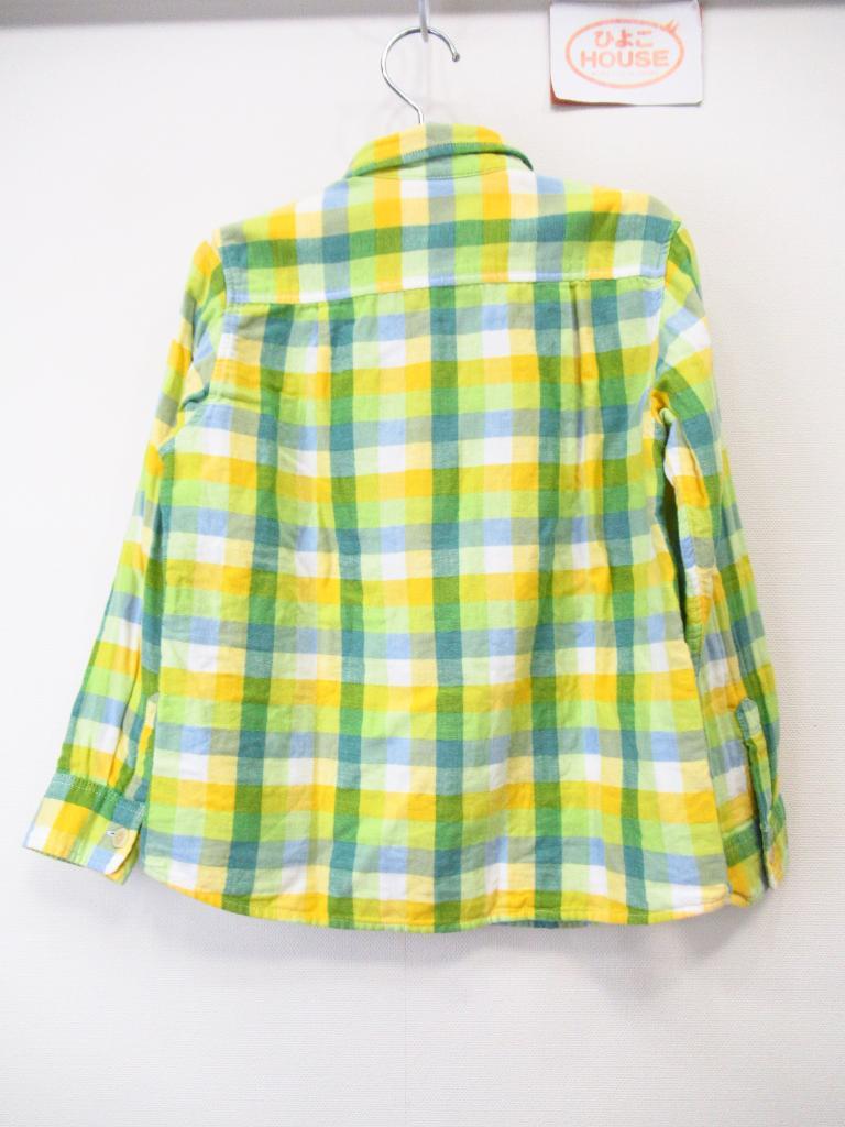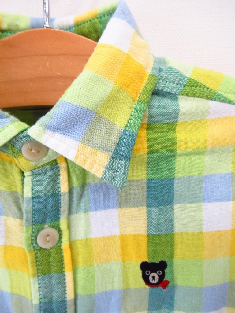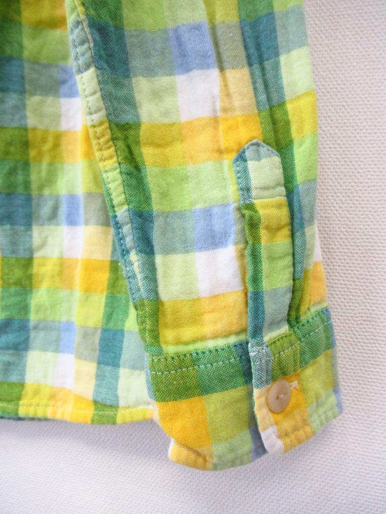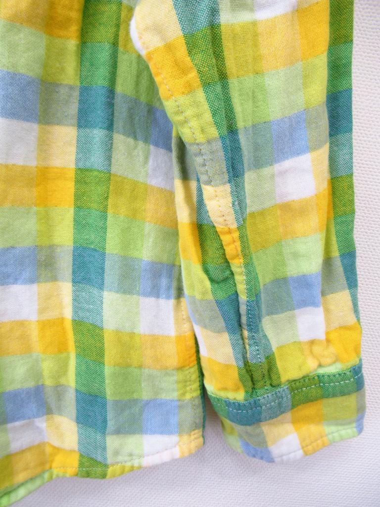 【ゆうパケット可能】 【実寸サイズ】肩幅31.2身幅41袖丈43着丈50 【デザイン】緑×黄色×水色×白のチェック 長袖シャツ ガーゼ地 左胸にBくん刺しゅう 替えボタンあり 前・袖口ボタン 【状態】毛羽立ち少々、着用感中くらい |