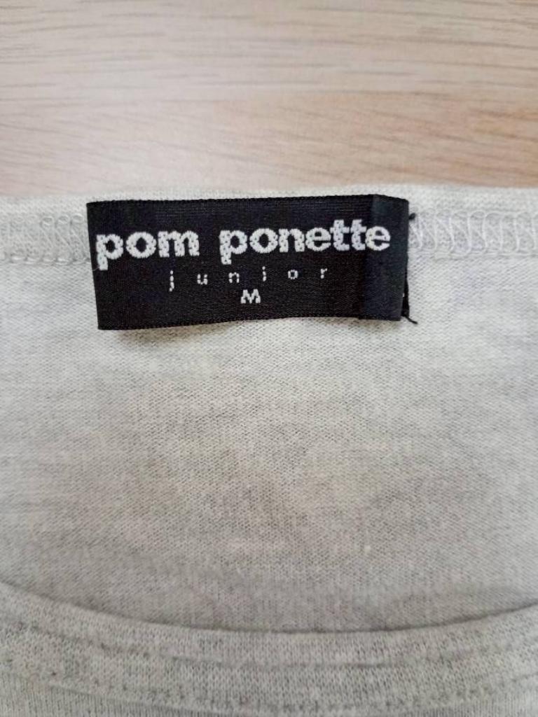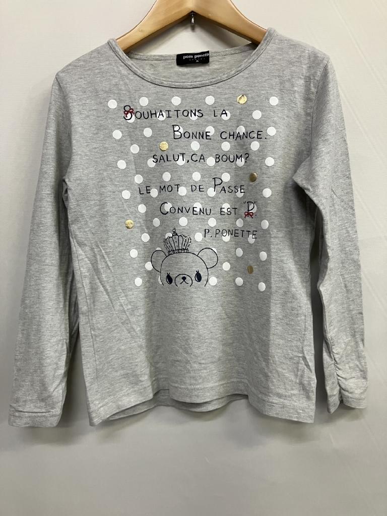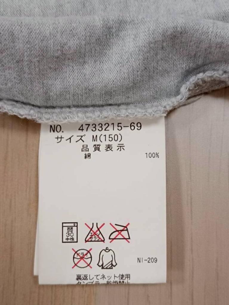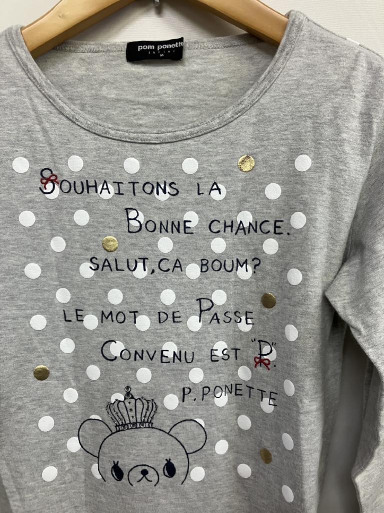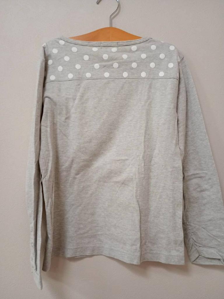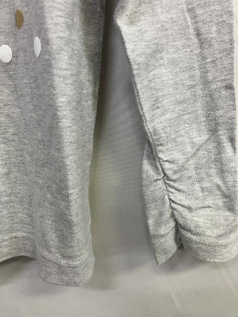 【メーカーサイズ】M(150) 【実寸(cm)】身幅38 着丈50 袖丈48 【素材】綿 【デザイン・色】グレー ゴールド 白等 一部ドットプリント Tシャツ地 前プリント・ラインストーン 袖口シャーリングゴム 【状態】少々毛羽立ち |