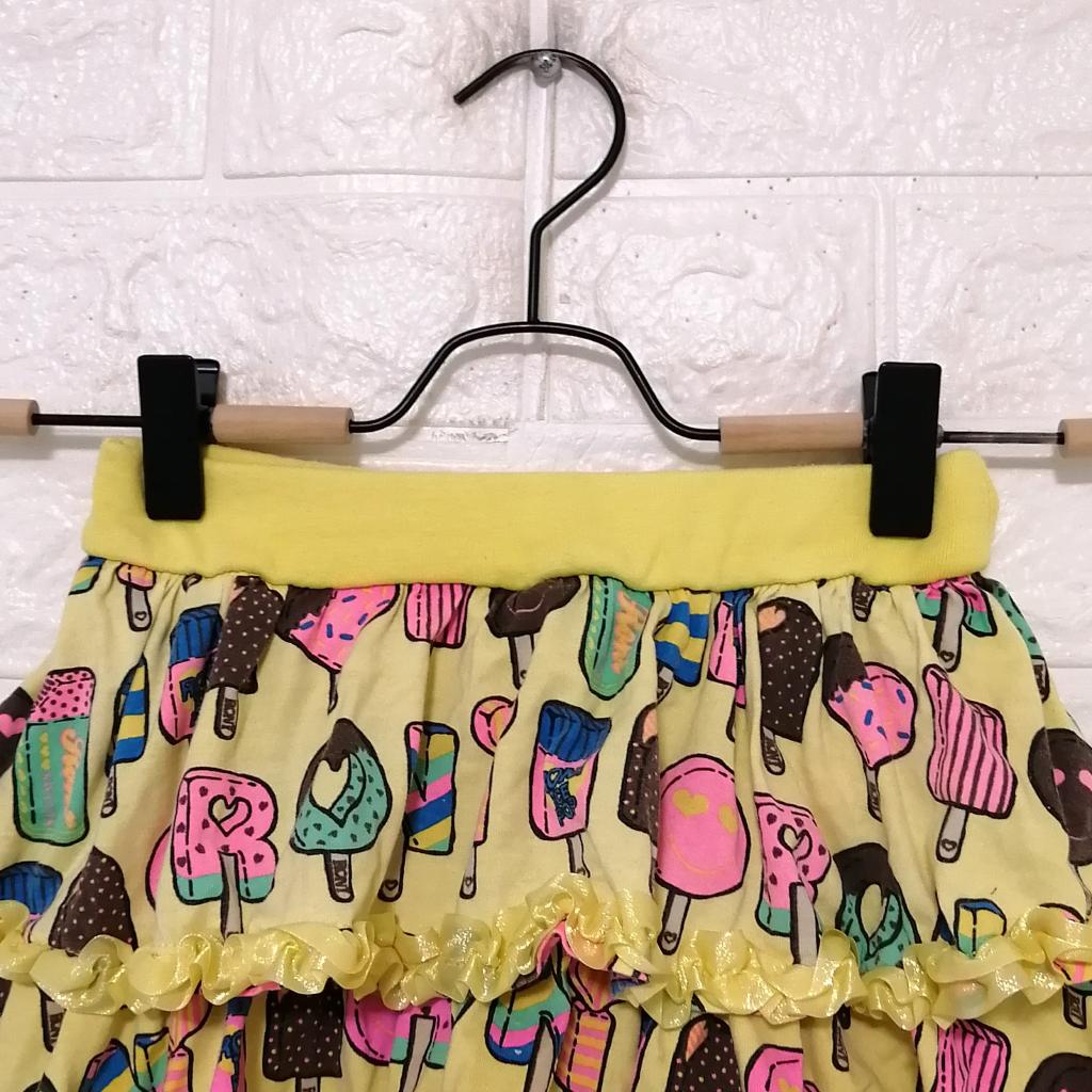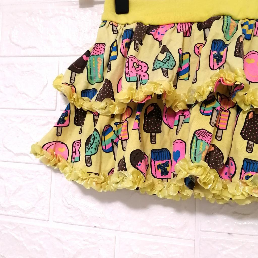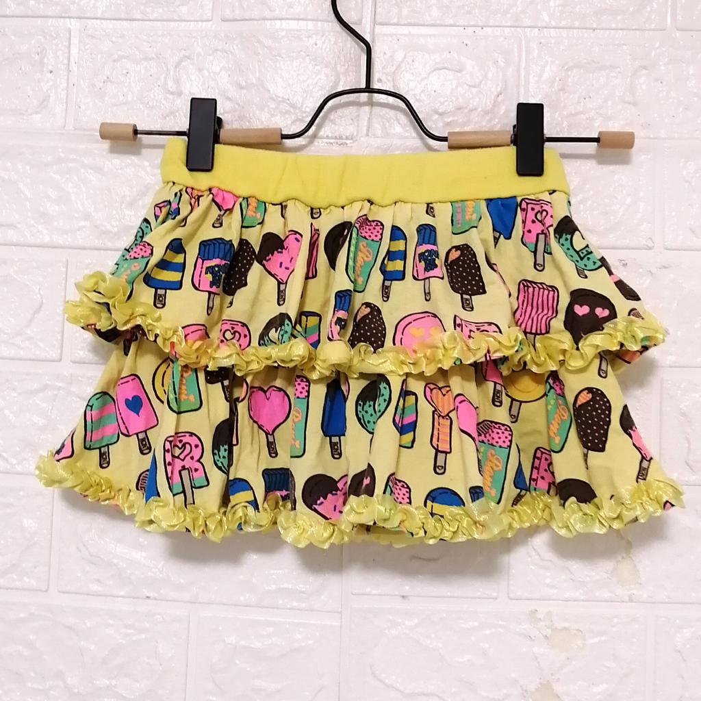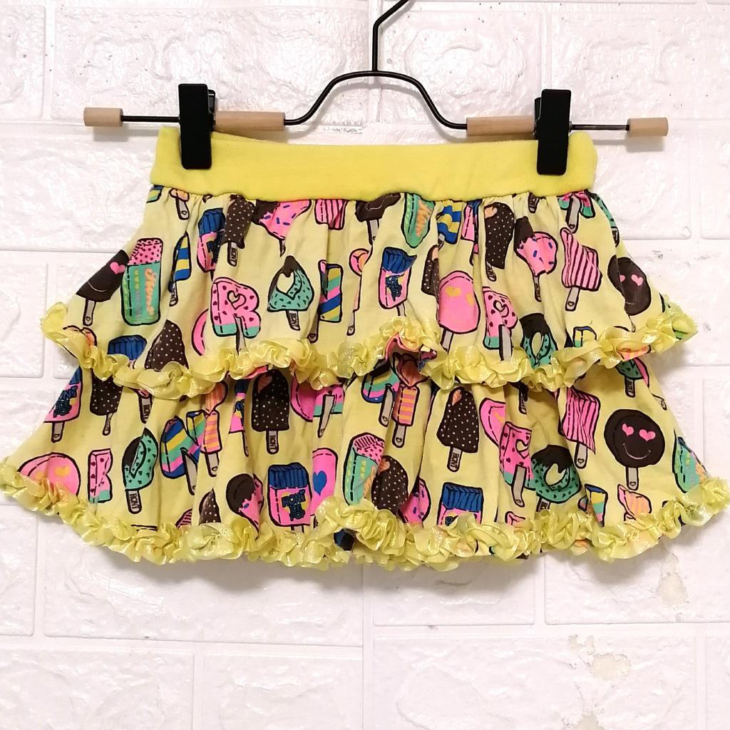 【ロニィ】 『アイスバー総柄段フリルスカート』 ◆[サイズ]=M(130) ◆[実寸(平置きcm)]=W幅25.5 スカート丈24 ◆[色]=イエロー ◆[デザイン]=ウエストアジャスターゴム アイスバー総柄 フレア 裾ラメ入りレース 裏地なし ◆[状態]=材質タグ色褪せあり 毛羽立ち・色あせややあり |