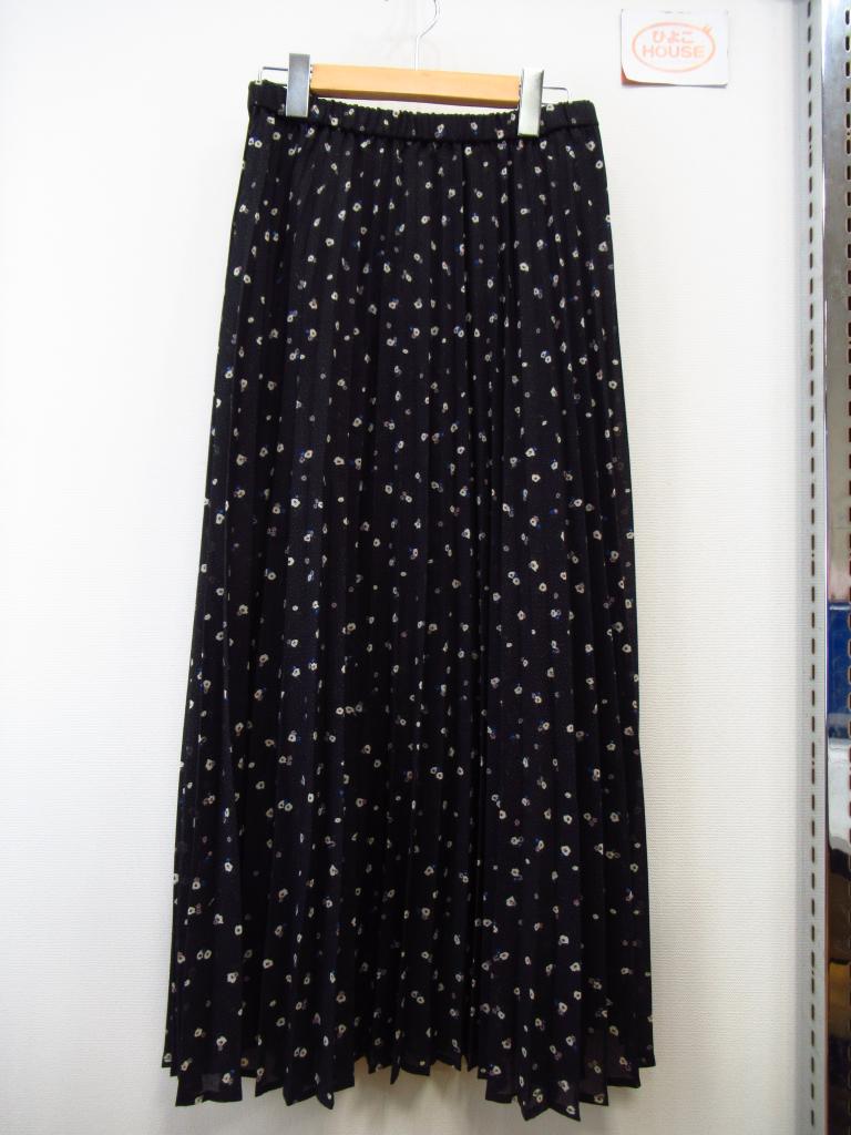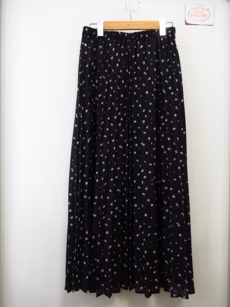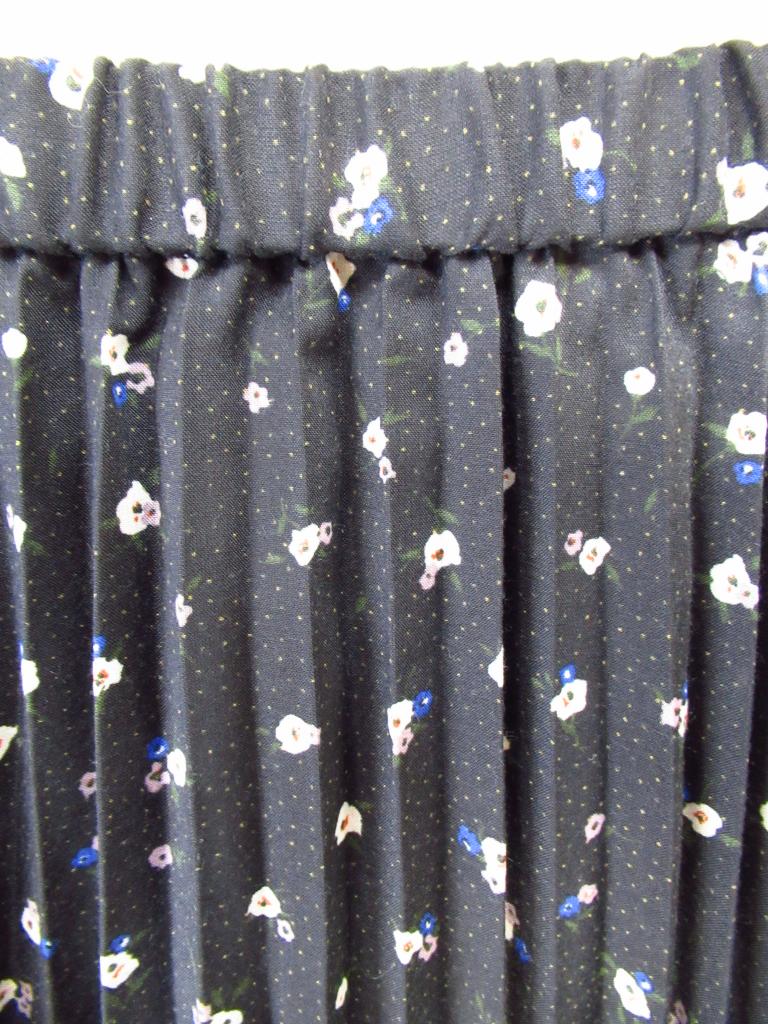 | コメント | 「シアープリーツスカート」 【材質】ポリエステル100、裏地:ポリエステル100 【実寸サイズ】ウエスト68スカート丈90 【デザイン】黒地に白青紫の小花柄 ウエスト総ゴム 裏地あり 定価3,990円(税込) |