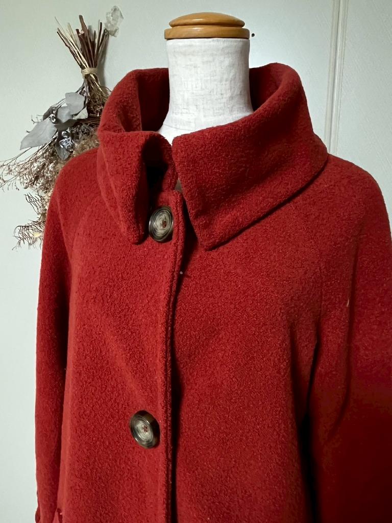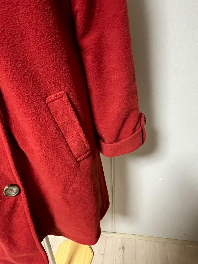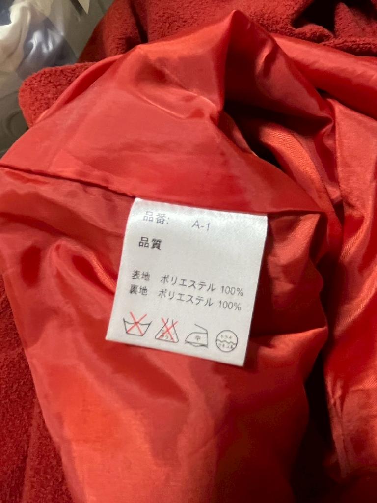 | コメント | 【評価】3 【サイズ】表示なし 【実寸】バスト96 着丈93 脇下66 ラグラン袖 【材質】ポリエステル100%(裏地)ポリエステル100% 【状態】毛羽立ち・着用感・色褪せ…少々 【色・デザイン】レッド 前開きボタン 前左右ポケット 【風合い】 〇 【生地の厚さ】 普通 【透け感】 なし |