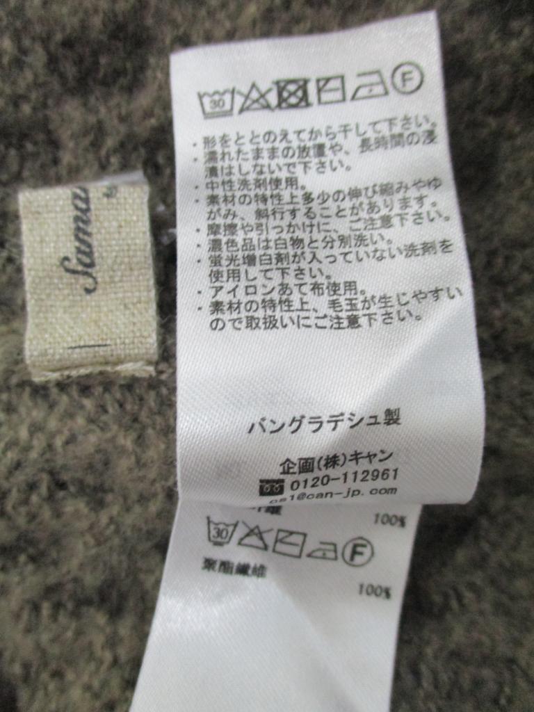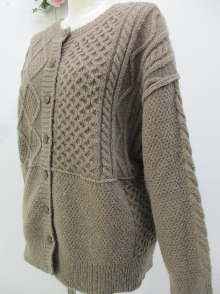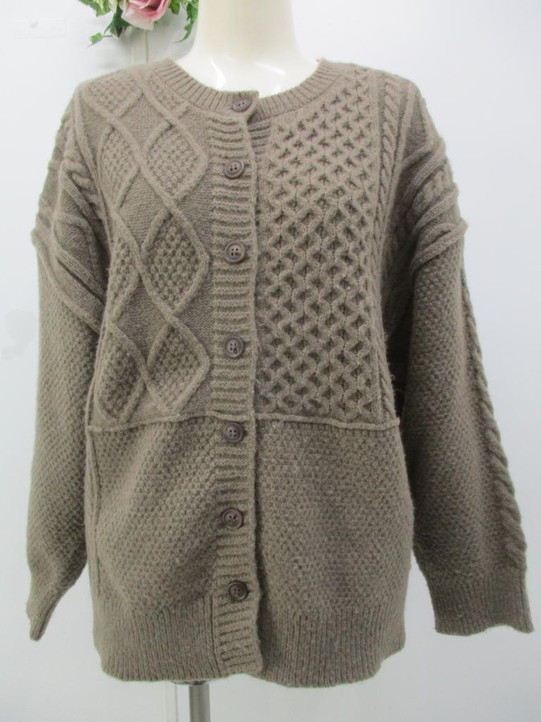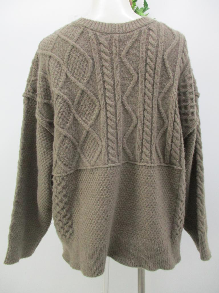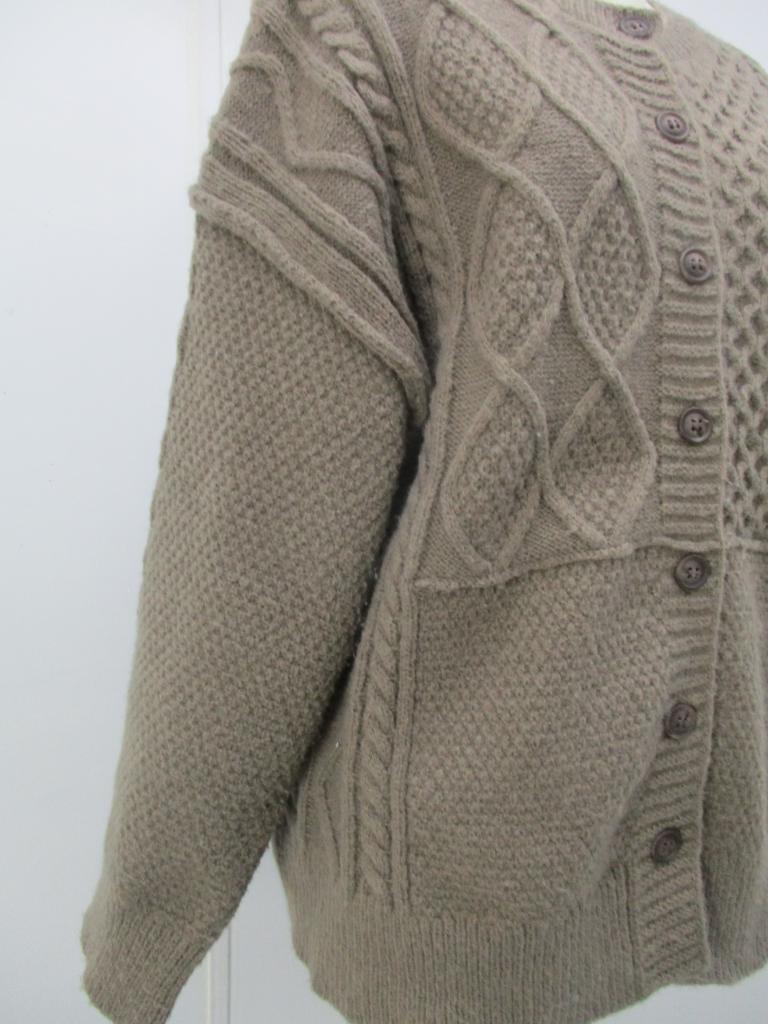 | コメント | 編み込み柄カーディガン♪ 【材質】ポリエステル100% 【記載サイズ】F 【実寸サイズ】B104㎝ 着丈57㎝ 肩幅60㎝ 袖丈41㎝ 【生地説明】ニット編み込み柄地 【色・柄】トープ 【デザイン特徴】前ボタン止め全開可。襟、袖口、裾、リブ地。ポケットはありません。 【商品状態】特になし |