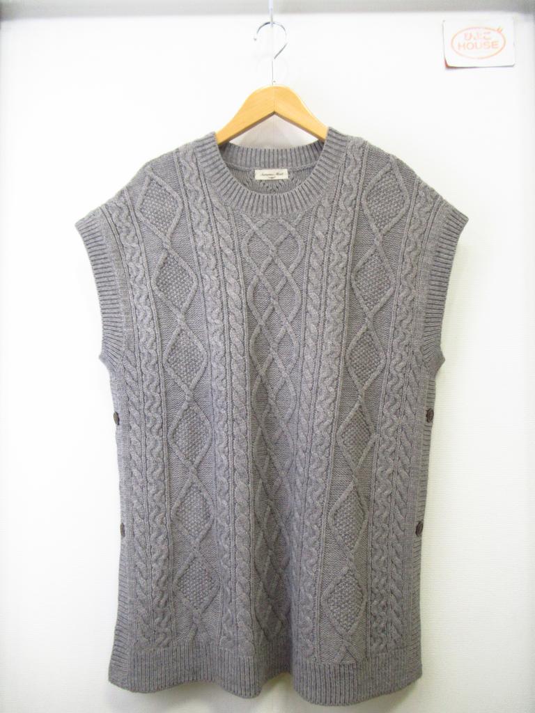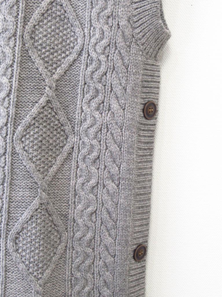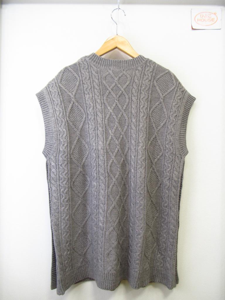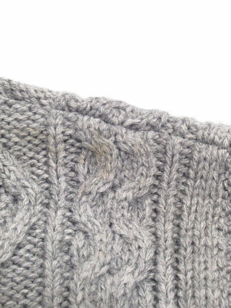 | コメント | 「ケーブル脇釦ニットベスト」 【材質】アクリル80ナイロン5毛15 【実寸サイズ】バスト113ゆき丈32.5着丈72 【デザイン】杢グレー ロング丈 ニット地 両サイドボタン 【状態】右肩に薄茶汚れ約5cm内にポツポツ 着用感・色あせ・毛羽立ち少々 |
