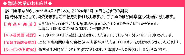 | 発送までの日数 | ※3/5~3/10の期間は発送お休みとなります。次回3/11の発送。 |