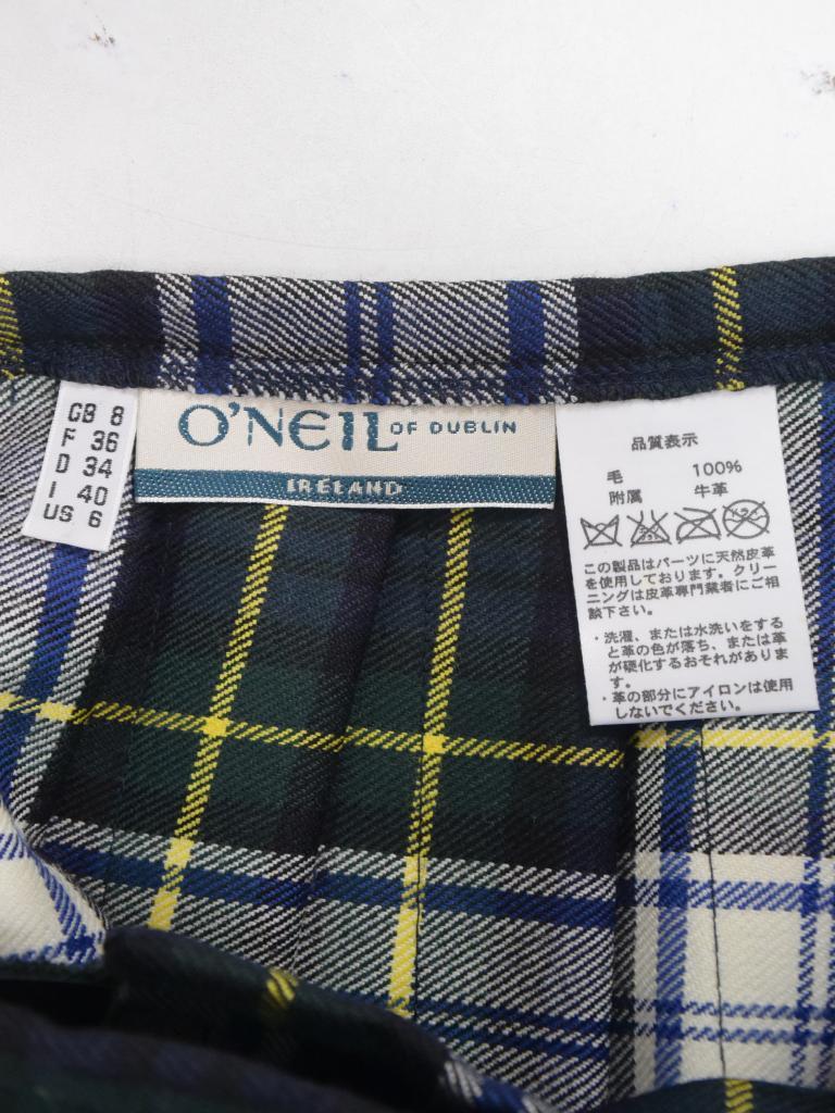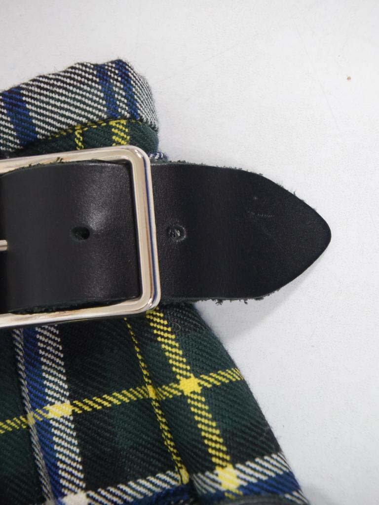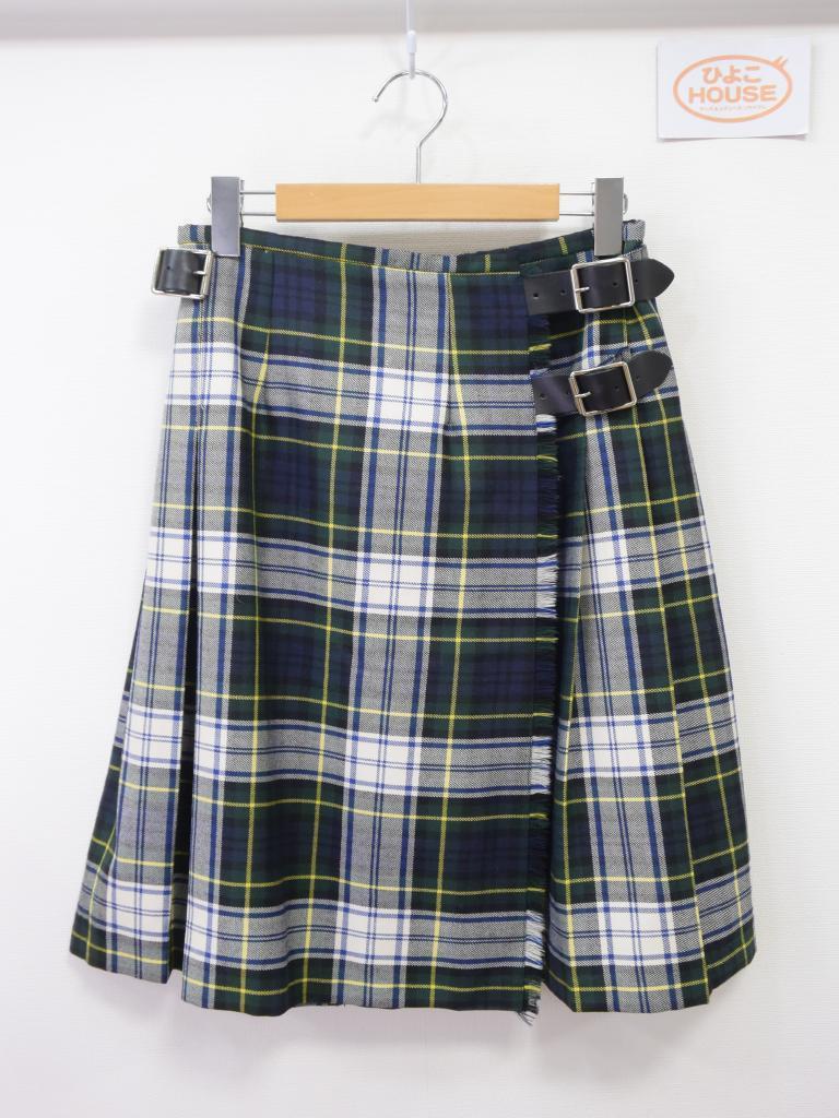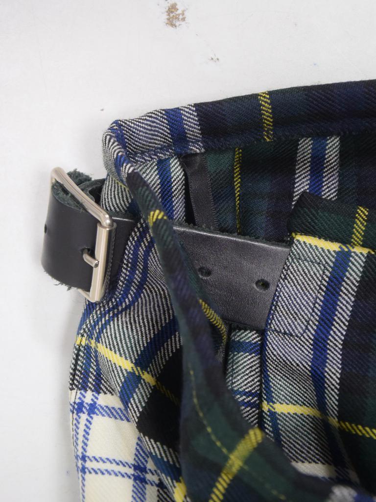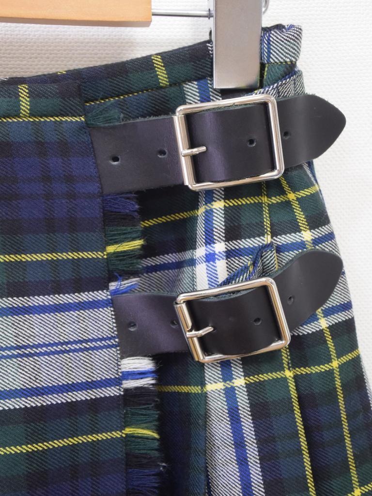 | コメント | 【サイズ表記】GB8/US6 【材質】毛100、附属:牛革 【実寸サイズ】ウエスト64~72スカート丈62ヒップ95 【デザイン】キルトスカート 紺×緑×オフホワイト×黄のチェック ひざ下丈 ウエスト両サイドのベルトで着脱、ラップデザイン 前サイドから後ろにプリーツ入り 【状態】ベルト部分に薄い線キズほんの少々 着用感・毛羽立ち少々 保存上のシワあり |