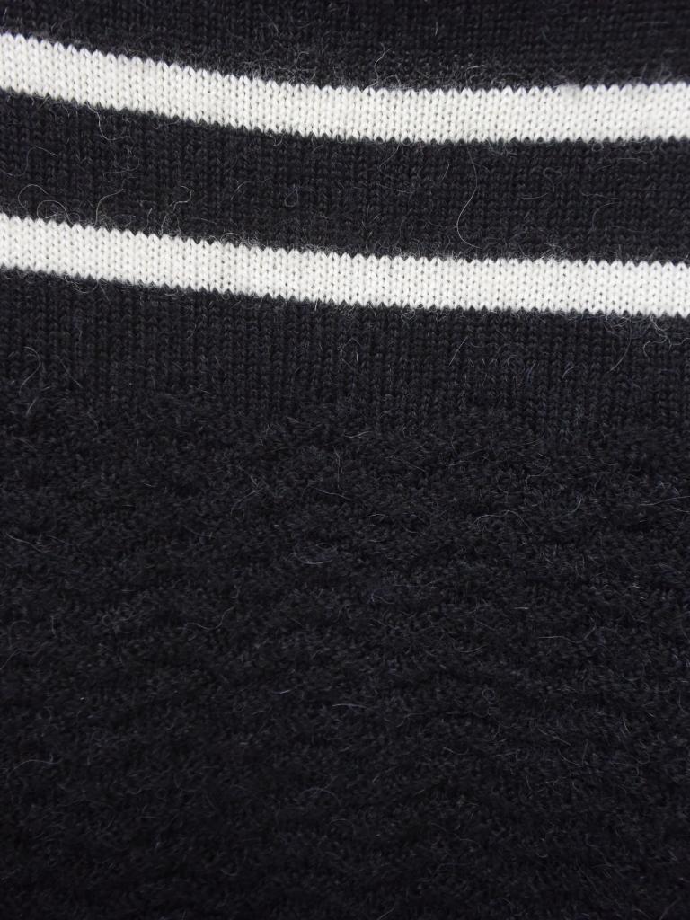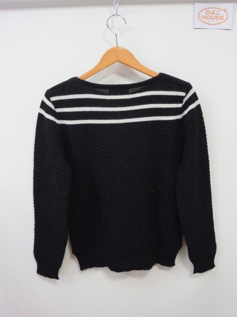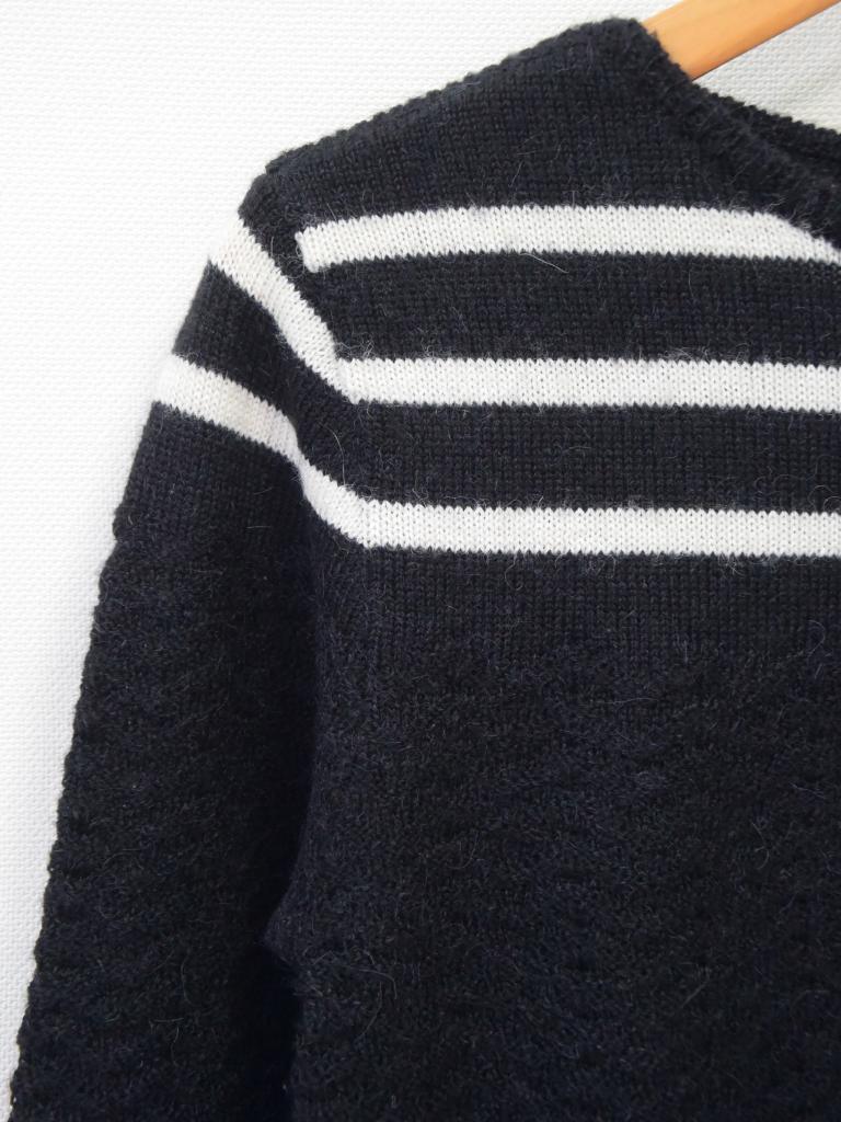 | コメント | 【材質】アクリル50毛30アルパカ20 【実寸サイズ】バスト90肩幅36袖丈51.5着丈57.5両サイド裾スリット8.5 【デザイン】黒×オフホワイト ボーダーライン入り模様編みニット プルオーバー ニット地 【状態】着用感・色あせ・毛羽立ち少々、毛玉ほんの少々 |
