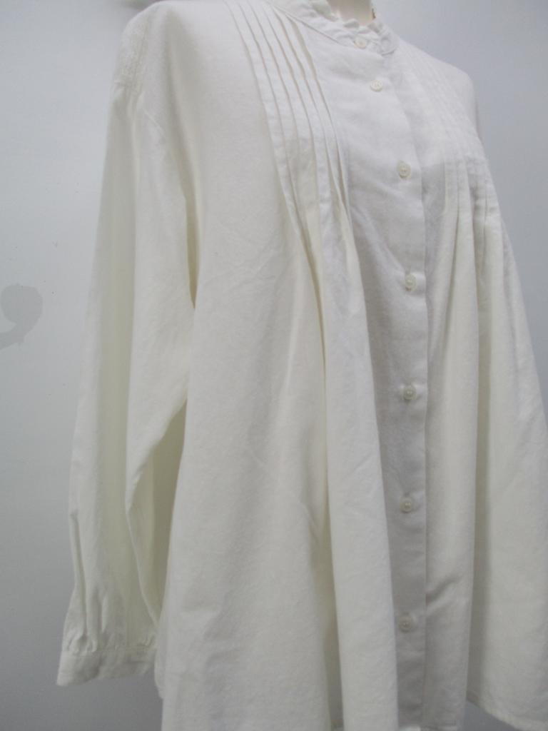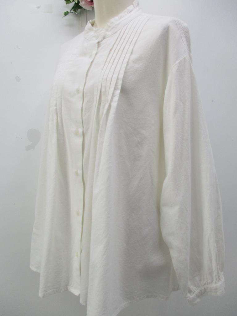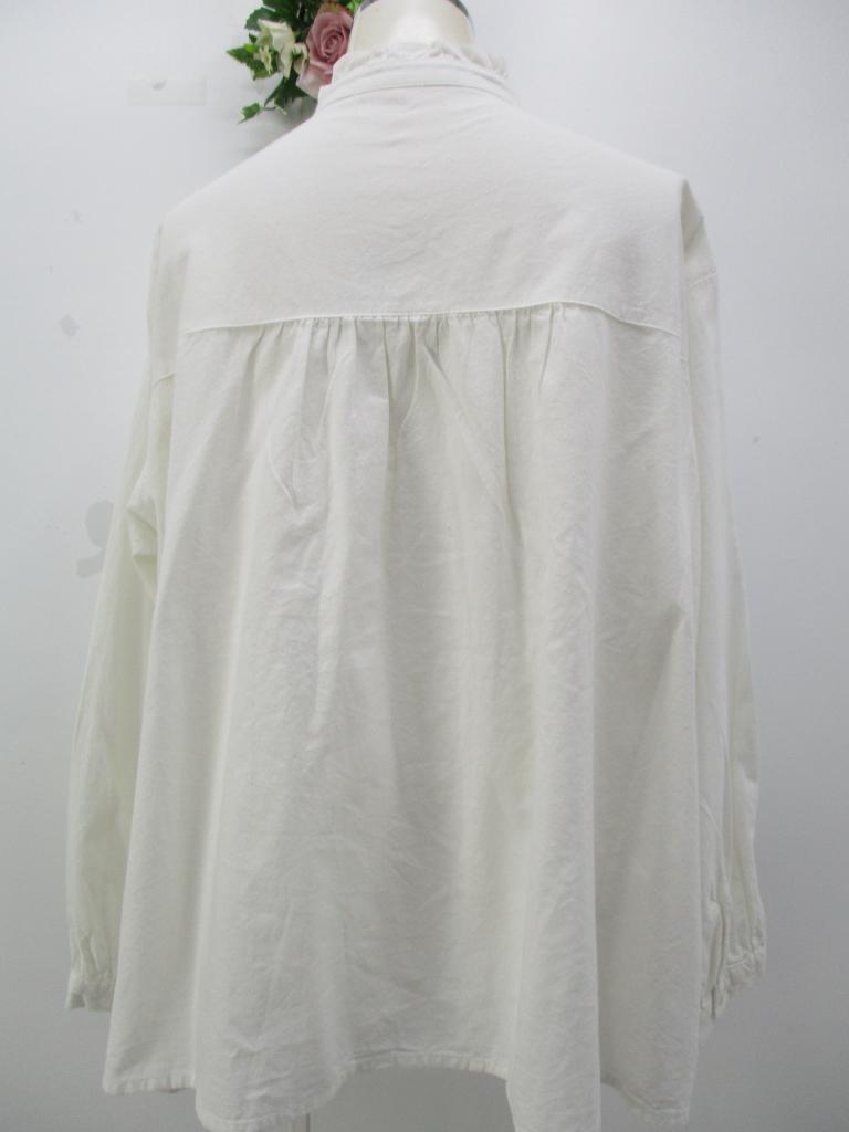 | コメント | 【クリックポスト発送可250円】 ★スタンドカラー&フリル付き♪ 【材質】綿100%/レース棉100% 【実寸サイズ】B112㎝ 着丈64㎝ 肩幅48㎝ 袖丈50㎝ 【生地説明】綿地 【色・柄】オフホワイト 【デザイン特徴】前タック入り&レース付き 前ボタン止め全開可。袖口ボタン止め1か所。 【商品状態】特になし。 |