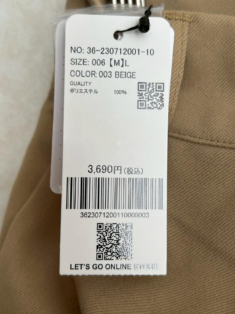 | コメント | 【実寸約】W66 H98 股上36 股下67 わたり35 裾幅30 【サイズ表示】M 【アイテム】パンツ 【素材%】ポリエステル100 【色】ベージュ 【ウエスト状態】ゴム 【ポケット有無】あり 【状態・シミやホツレ等】なし 【着用感】新品未使用 【備考】 |