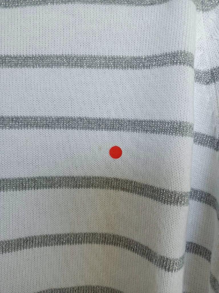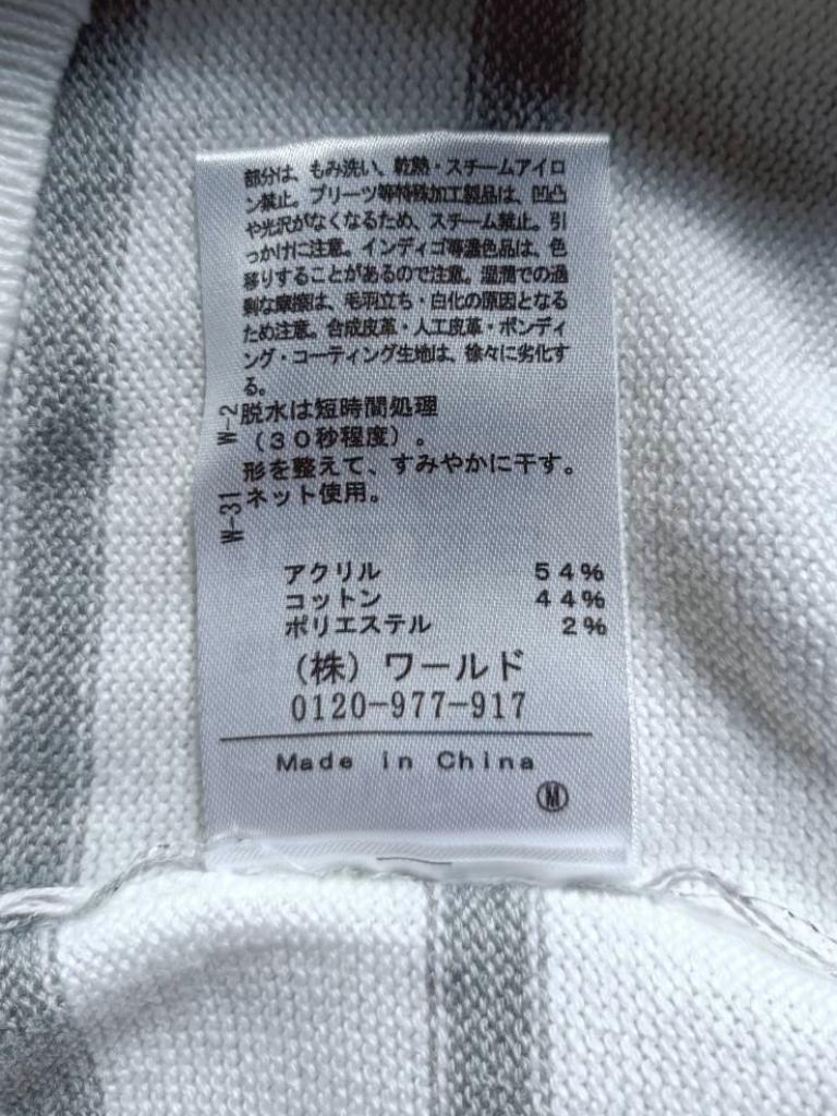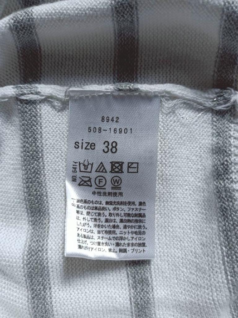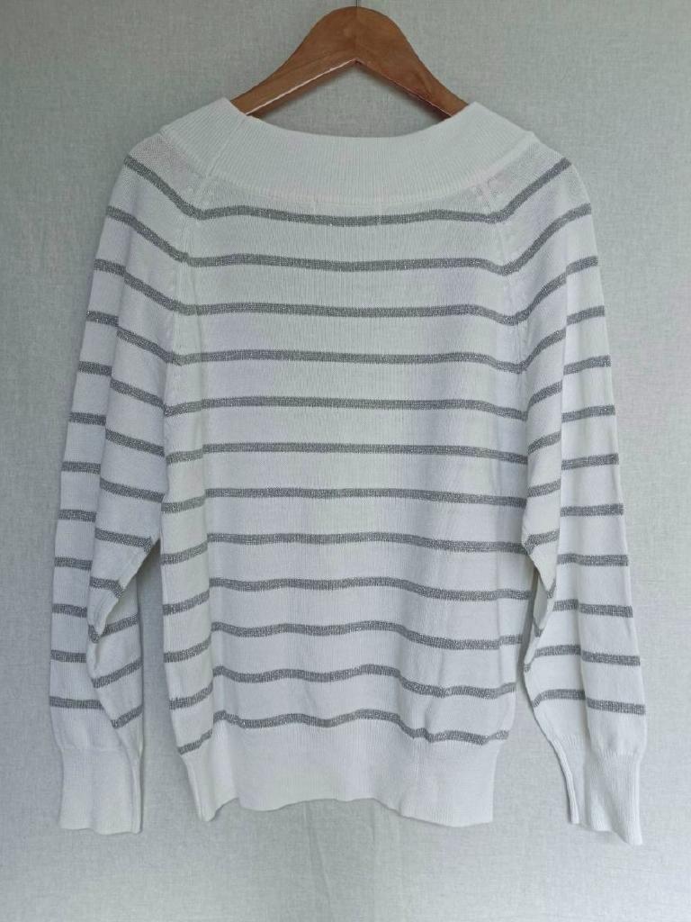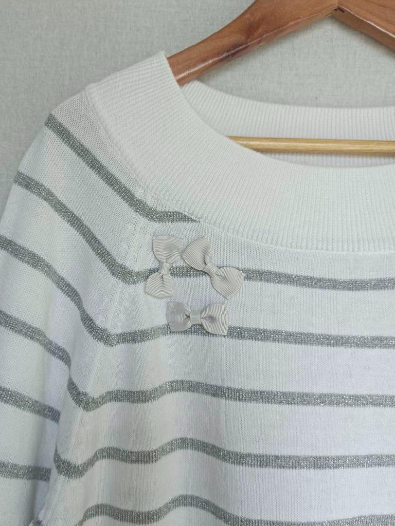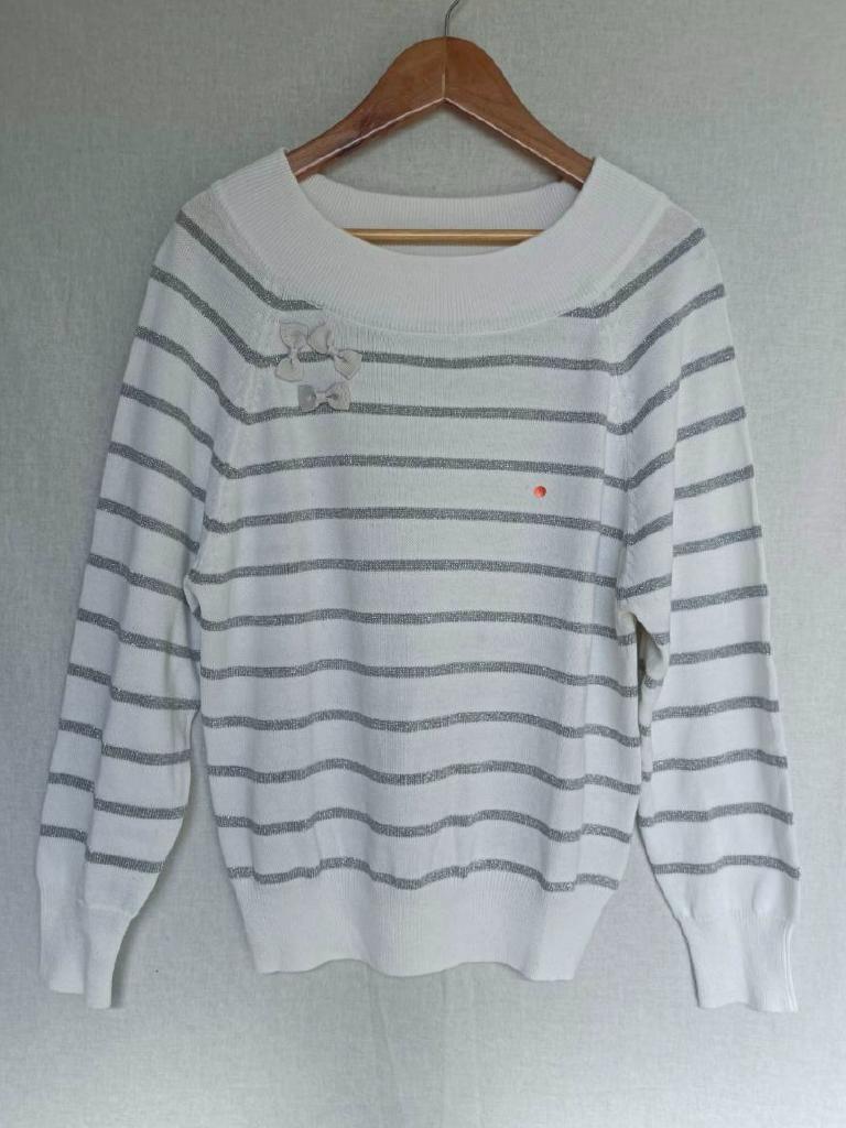 | コメント | 【メーカーサイズ】38 【実寸(cm)】バスト90 着丈49.5 ゆき丈70 【素材】アクリル 綿 ポリエステル 【デザイン・色】白 グレー ボーダー柄 ニット地 胸元リボン付 衿元・袖口・裾リブ 【状態】少々毛羽立ち 胸元小さい汚れ #おすすめ #7223264 ☆ |
