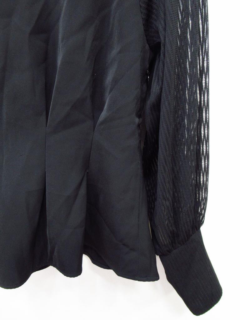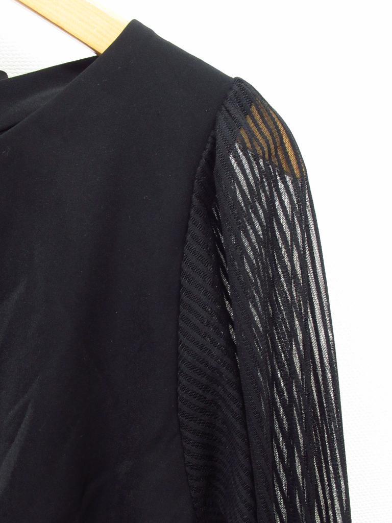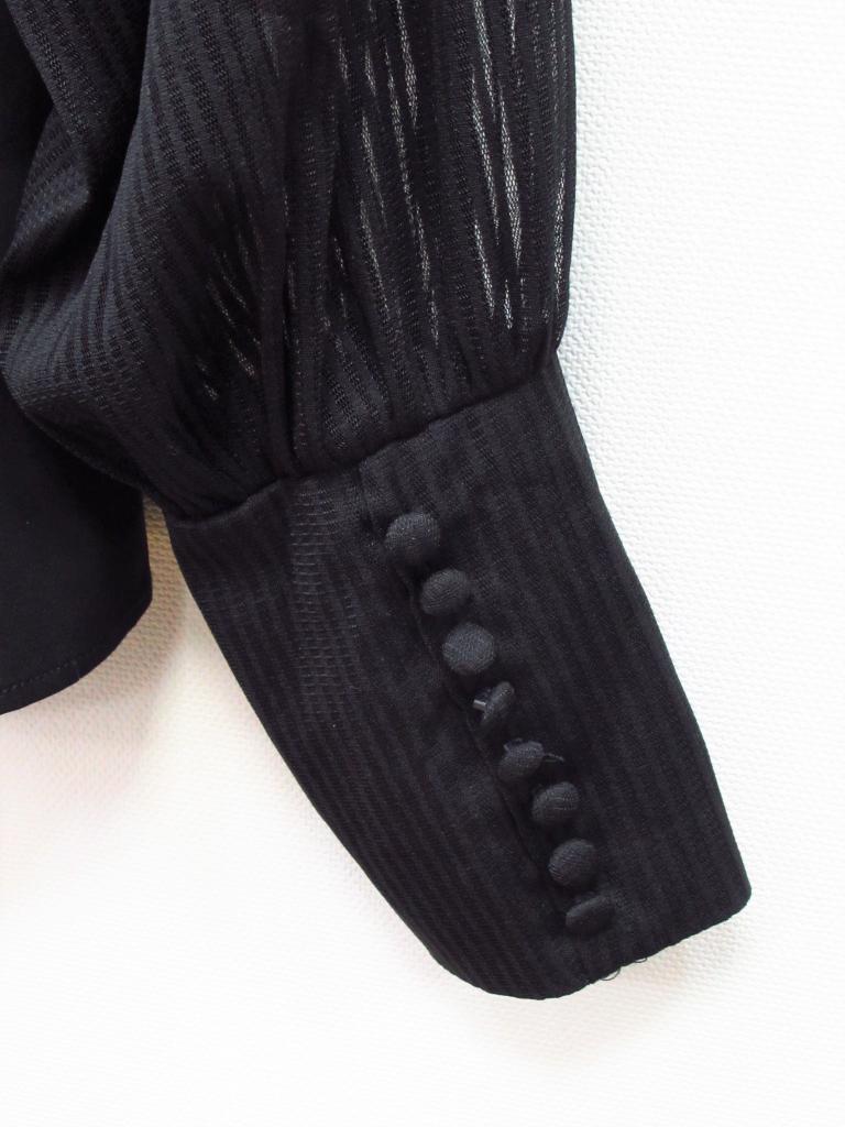 | コメント | 【ゆうパケット可能】 「バックリボントップス」 【材質】ポリエステル100、別布: ポリエステル100、裏地:ポリエステル96ポリウレタン4 【実寸サイズ】バスト84肩幅35袖丈58.5着丈36総丈54 【デザイン】黒 袖はストライプ柄チュール 袖口飾りボタン付き 裏地あり 横ファスナー 【状態】身頃にごく小さな引っかけ数ヵ所あり 着用感ほんの少々 |
