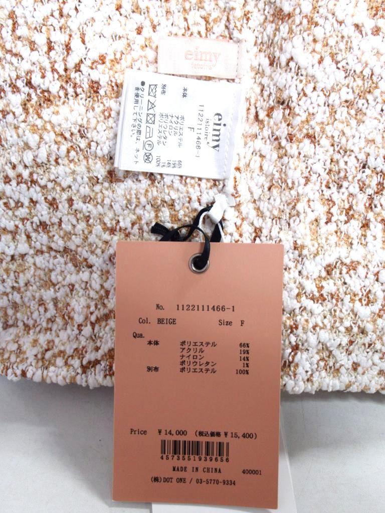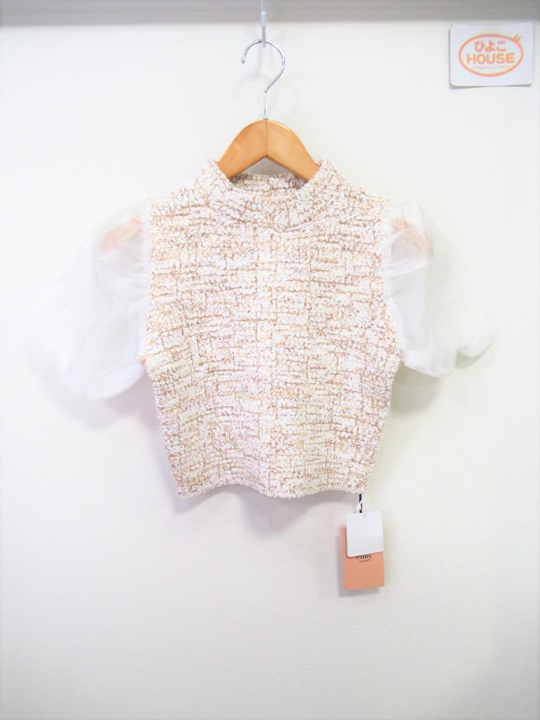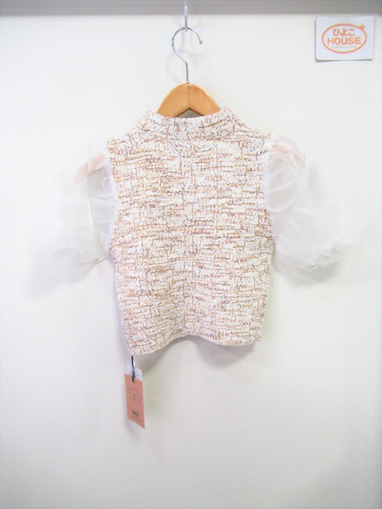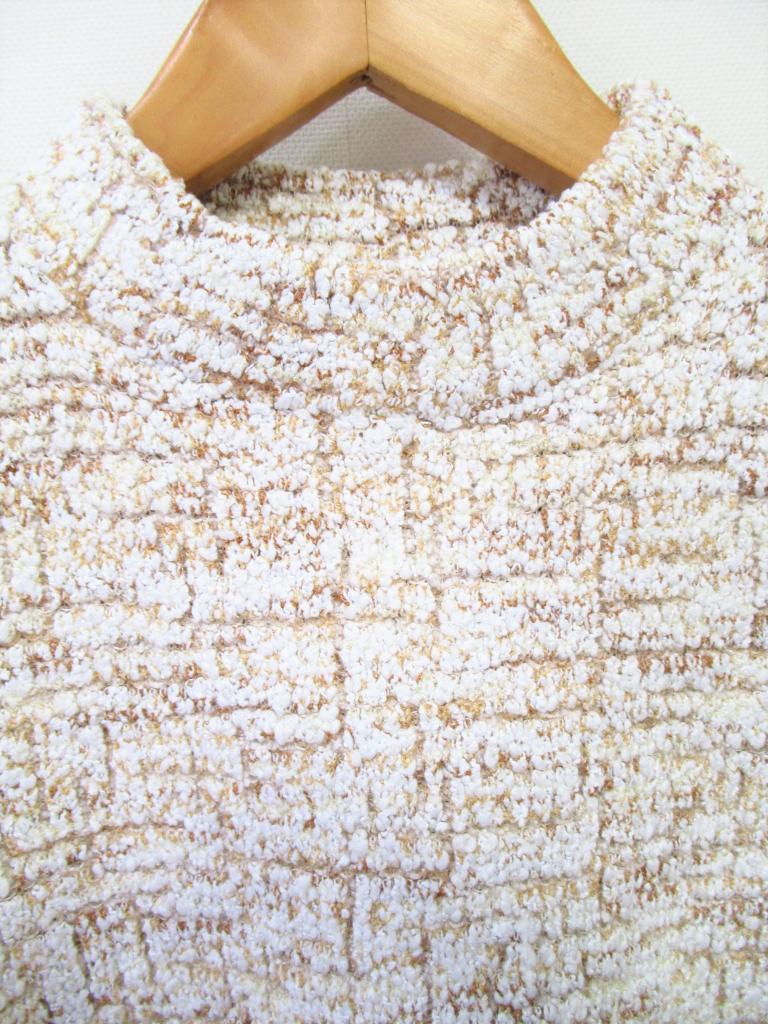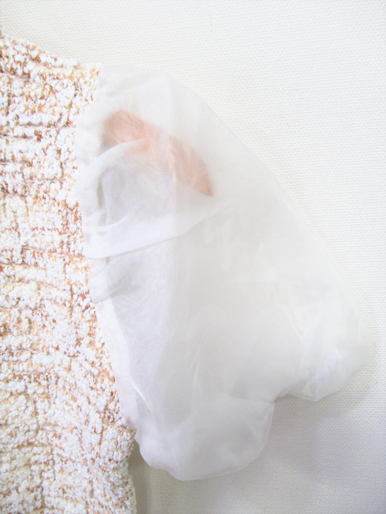 | コメント | 「パフスリーブツイードニット」 【材質】写真参照 【実寸サイズ】バスト74肩幅29.5袖丈22.5着丈37 【デザイン】濃淡ベージュ×ブラウン×オフホワイトのミックス 袖はオフホワイトのオーガンジー 半袖 ニット地 定価15,400円(税込) 2022年製 |