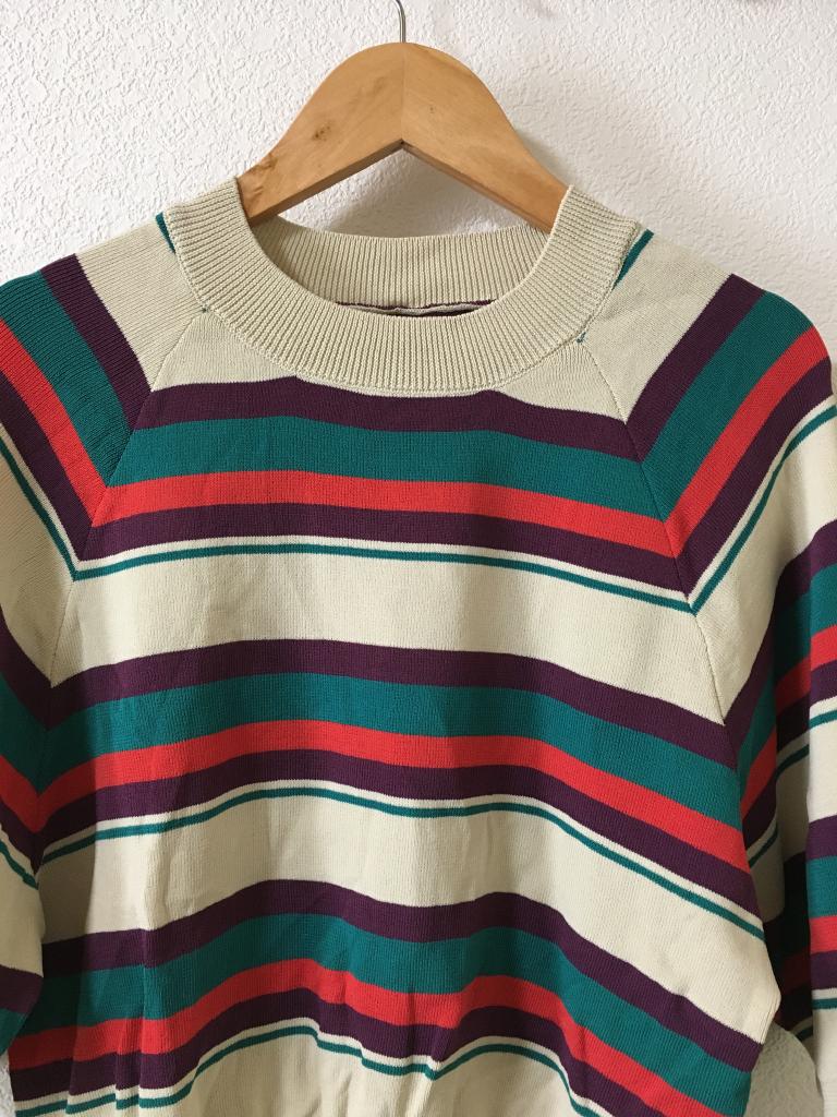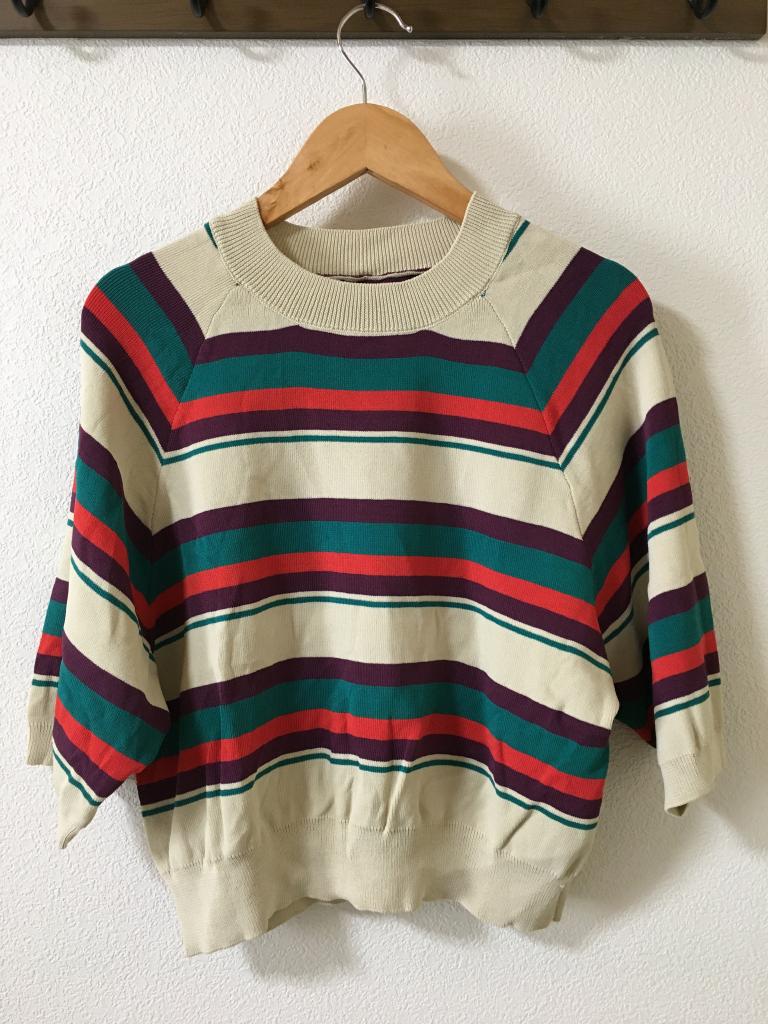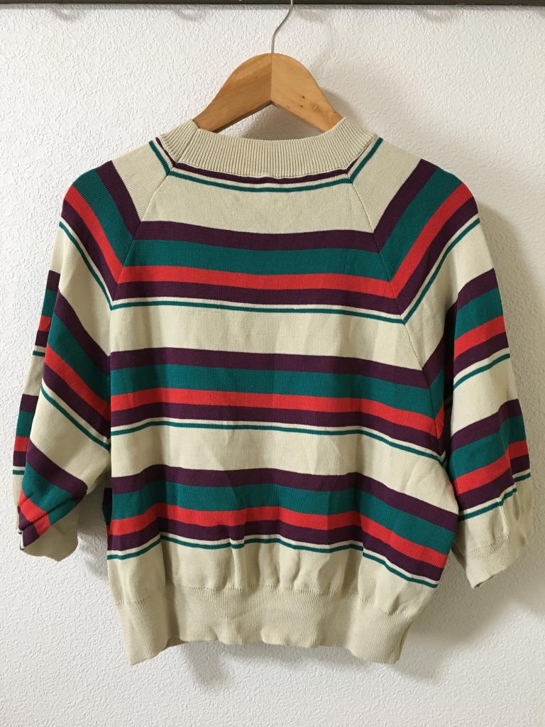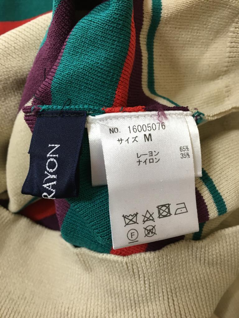 | コメント | 表示サイズ:M ベージュ×パープルなどのボーダー 全体的に毛羽ほんの少々 全体的にキレイです 着丈43 身幅45 ゆき丈48 |