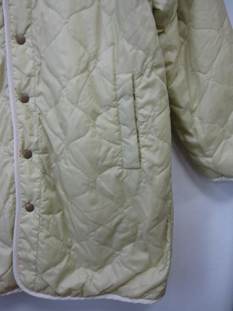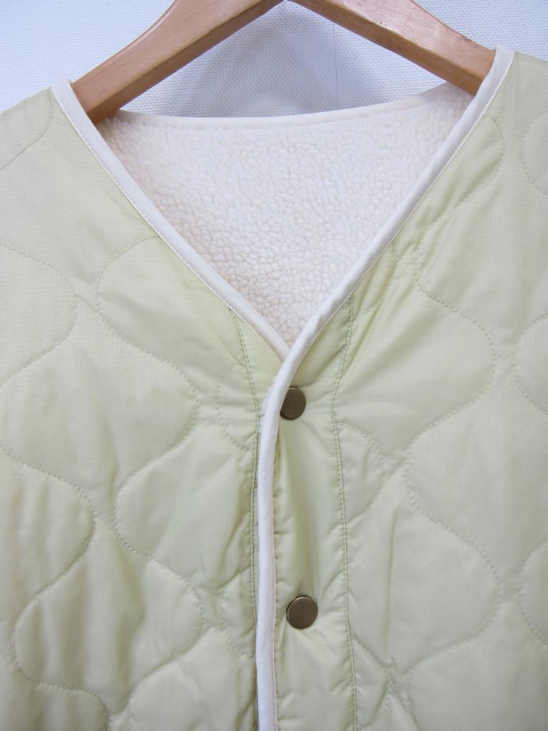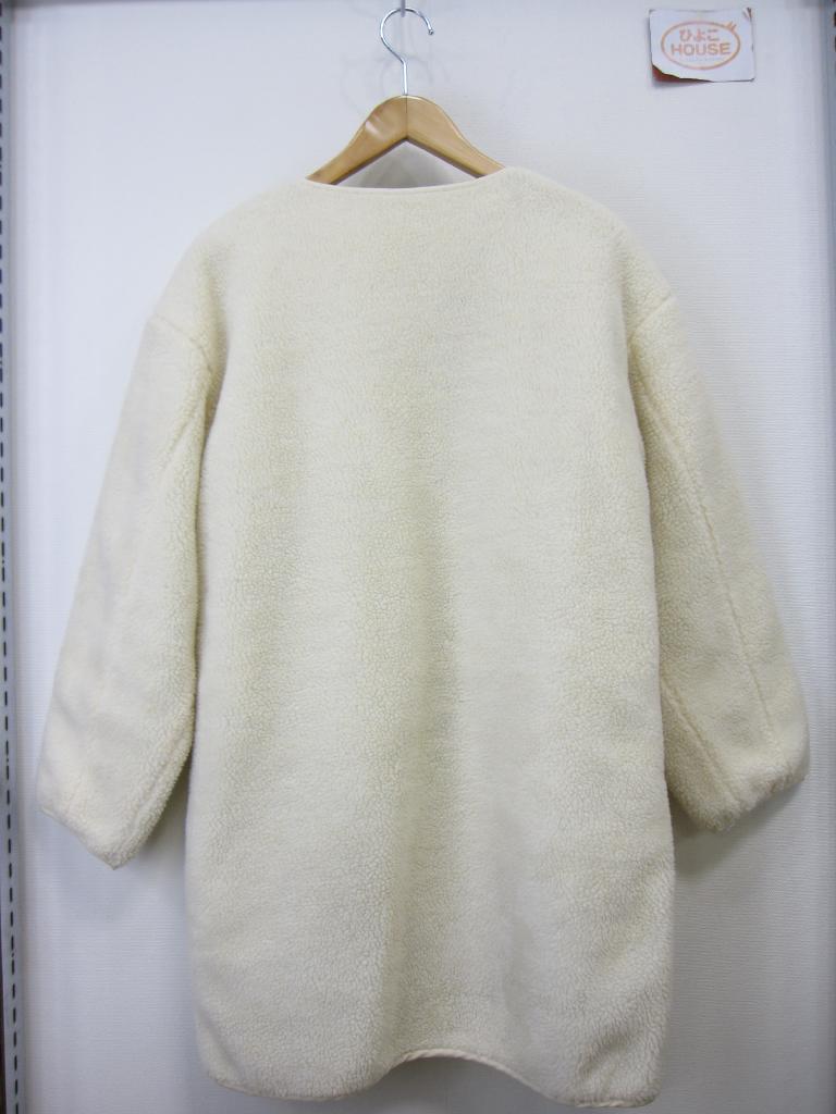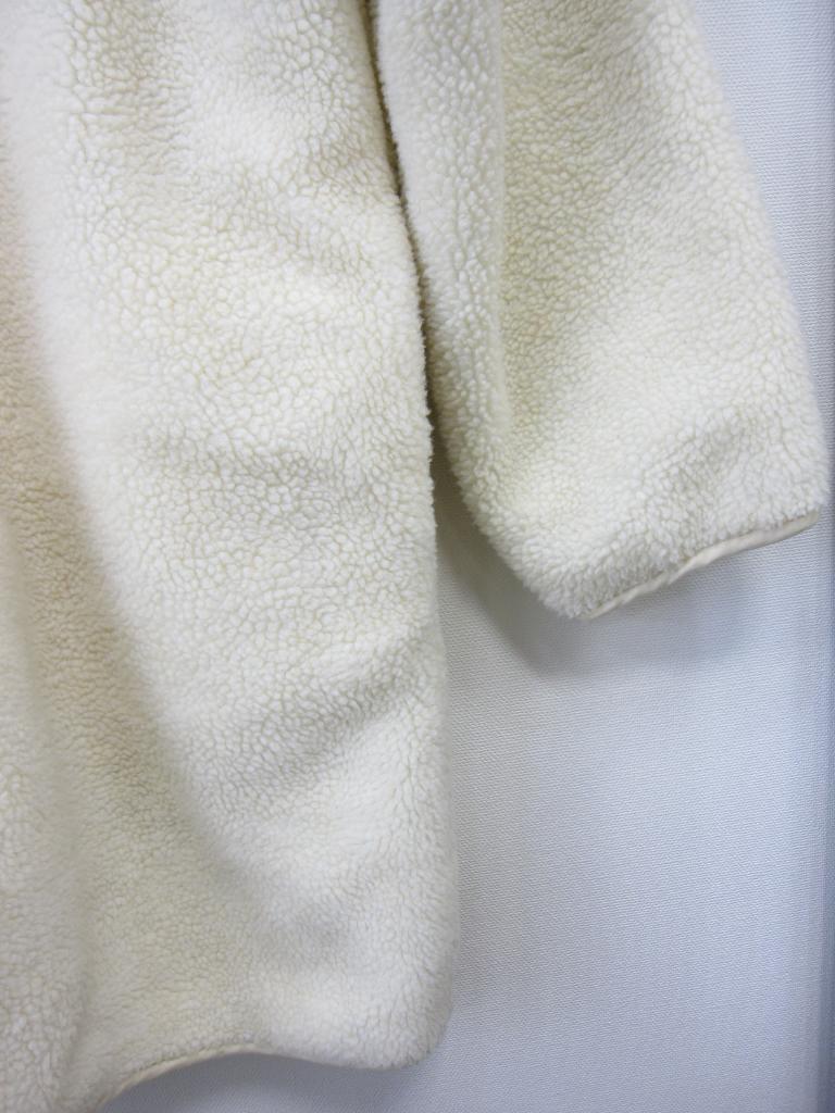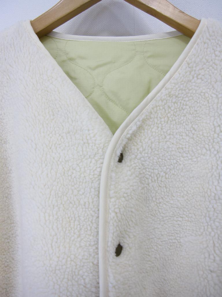 | コメント | 【材質】表側基布:ポリエステル100、ボア部分:ポリエステル100、裏側:ポリエステル100 【実寸サイズ】バスト111肩幅54.5袖丈52着丈84 【デザイン】アイボリーボア地と薄い黄みどり、キルティングナイロン地のリバーシブル ノーカラーVネックコート 前スナップ、前左右ポケット(両面) 【状態】右前薄いオレンジのシミ2㎜ ボアのヘタリ少々 袖口パイピング部分くすみ、毛玉あり 着用感・色あせ中くらい |